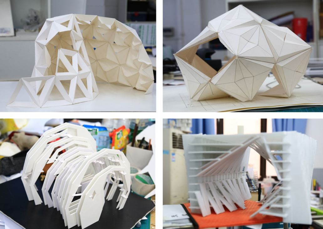本次活动以​yl7703永利大一员工的设计初步课程教学内容为基础,在金秋野、齐莹等指导教师的带领下,开展了以“轻房子建造”为设计理念的 “建大·建造”空间课程设计。以四人为一组进行模型制作,仔细把握建筑使用功能、人体尺度、空间形态等基本要求。要求同学们从独立设计推敲到团队合作深化,最终共同将手中原本柔软的折纸样本一步步建造成可以遮风避雨的精致构筑。