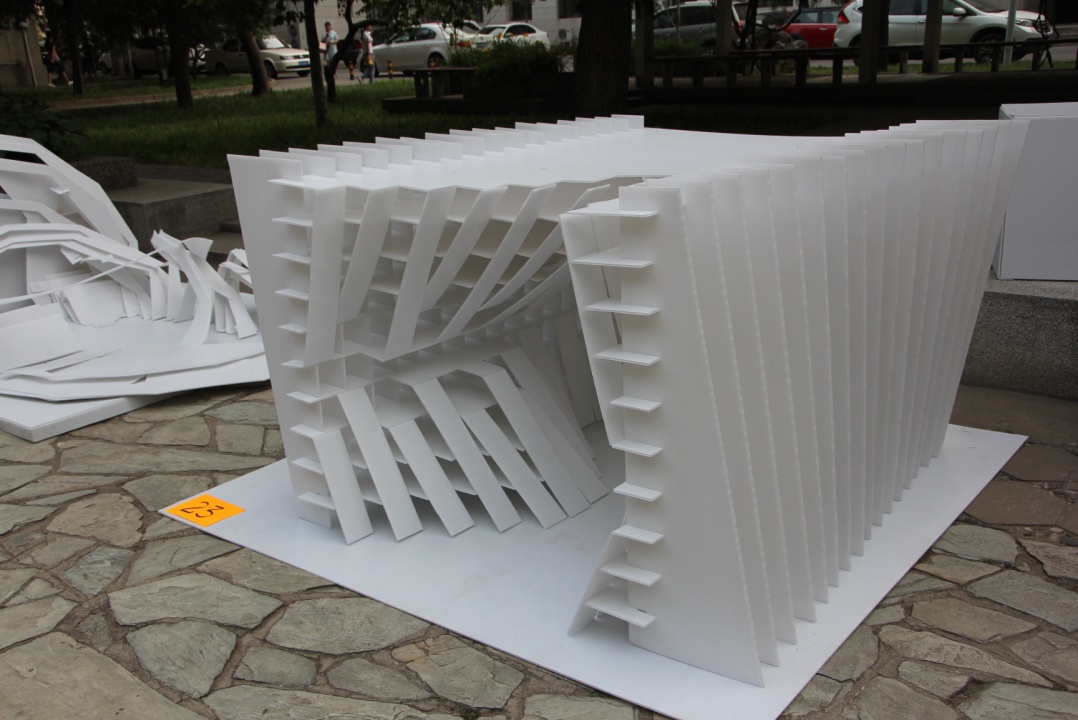 评比的当天在太阳光的照射下模型呈现出玄妙的光影效果,在场的评委老师无不为同学们的奇妙构思,大胆设计给深深吸引。得到老师的肯定的是,仅仅用一种材料,不用胶粘,不用钉子,完全依靠拼插建造出如此玄妙的空间,在创新中不经意传承着中国传统的榫卯结构,意匠巧工。