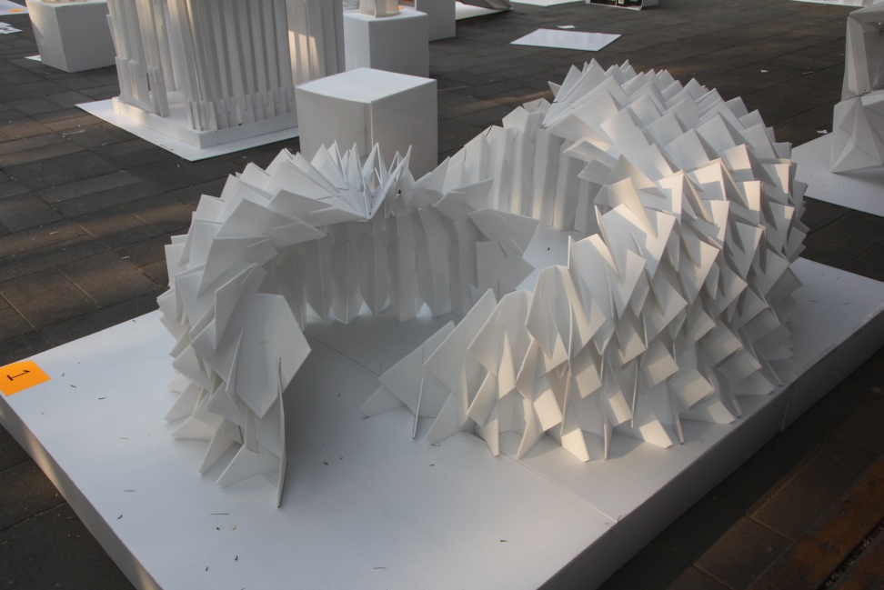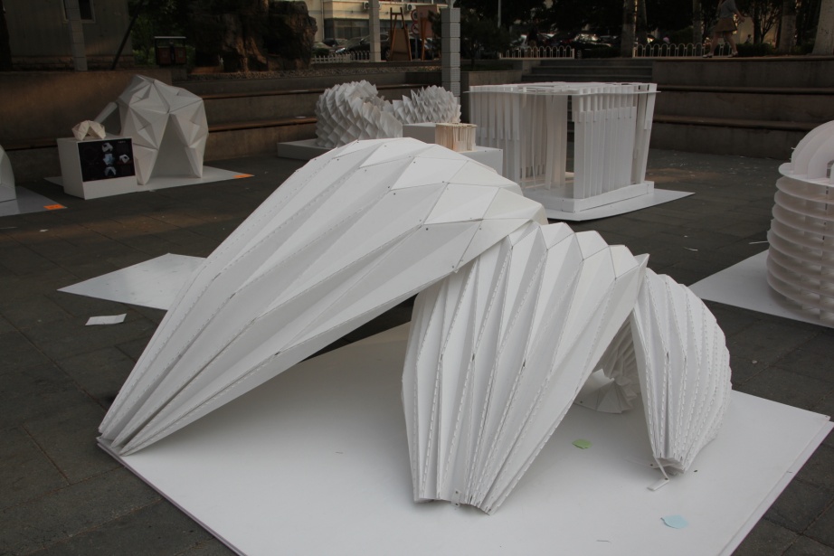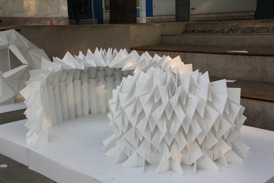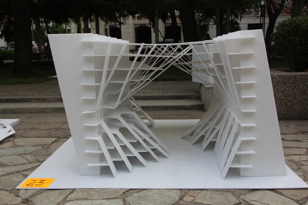 “折折”是本届建造节的一等奖,设计灵感来源于日本横滨国际码头,造型独特的模型吸引了众多人的眼光。不同于别的小组拼接方式,该设计最大的亮点在于结合材料特性,是唯一运用整板折叠而成的设计。查阅资料,小组成员计划在稳定性和抗压性不变的条件下,增加支撑点,并以一个单元为基础组件,将三个大小不一的单元进行拼合和适当的变形,在下沉广场,“折折”成了一道独特的风景线。