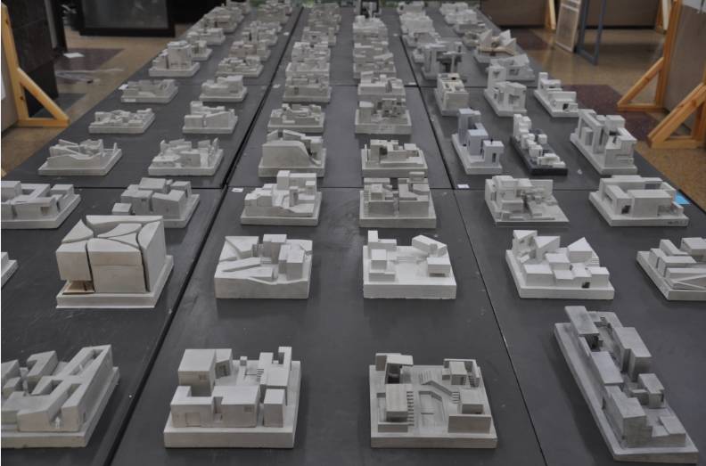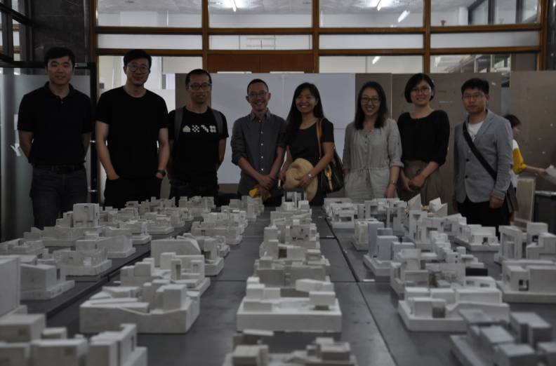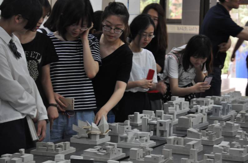 5月8日下午15时,在西城校区图书馆一层大厅的桌面上摆满了员工制作的混凝土模型,周围展板上的水墨渲染图纸看上去充满着意境。