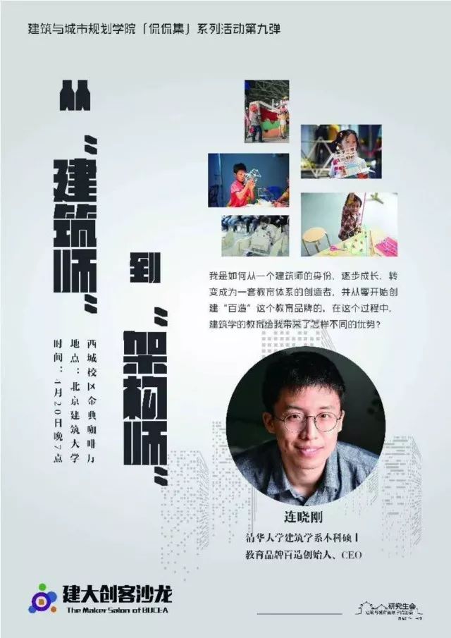建大创客沙龙——第九期侃侃集系列员工沙龙活动圆满结束,连晓刚学长及其团队利用建筑学思维建立的拓展思维的教学体系,实现自身在教育方面价值,让在座同学感受到了通过建筑学学习带来的其他可能性,引人深思。