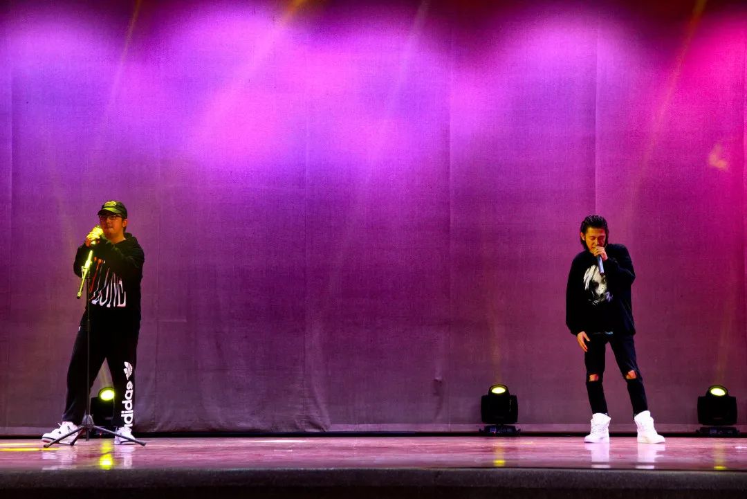第二个节目让全场达到了第一个小高潮,来自园林181的刘伊然和刘宇彤刚一亮相就气场全开。一个一袭长裙,高音贯穿全场;一个一身朋克装扮,rap酷劲十足。两个人仿佛天作之合,每个人都情不自禁地跟唱了起来。