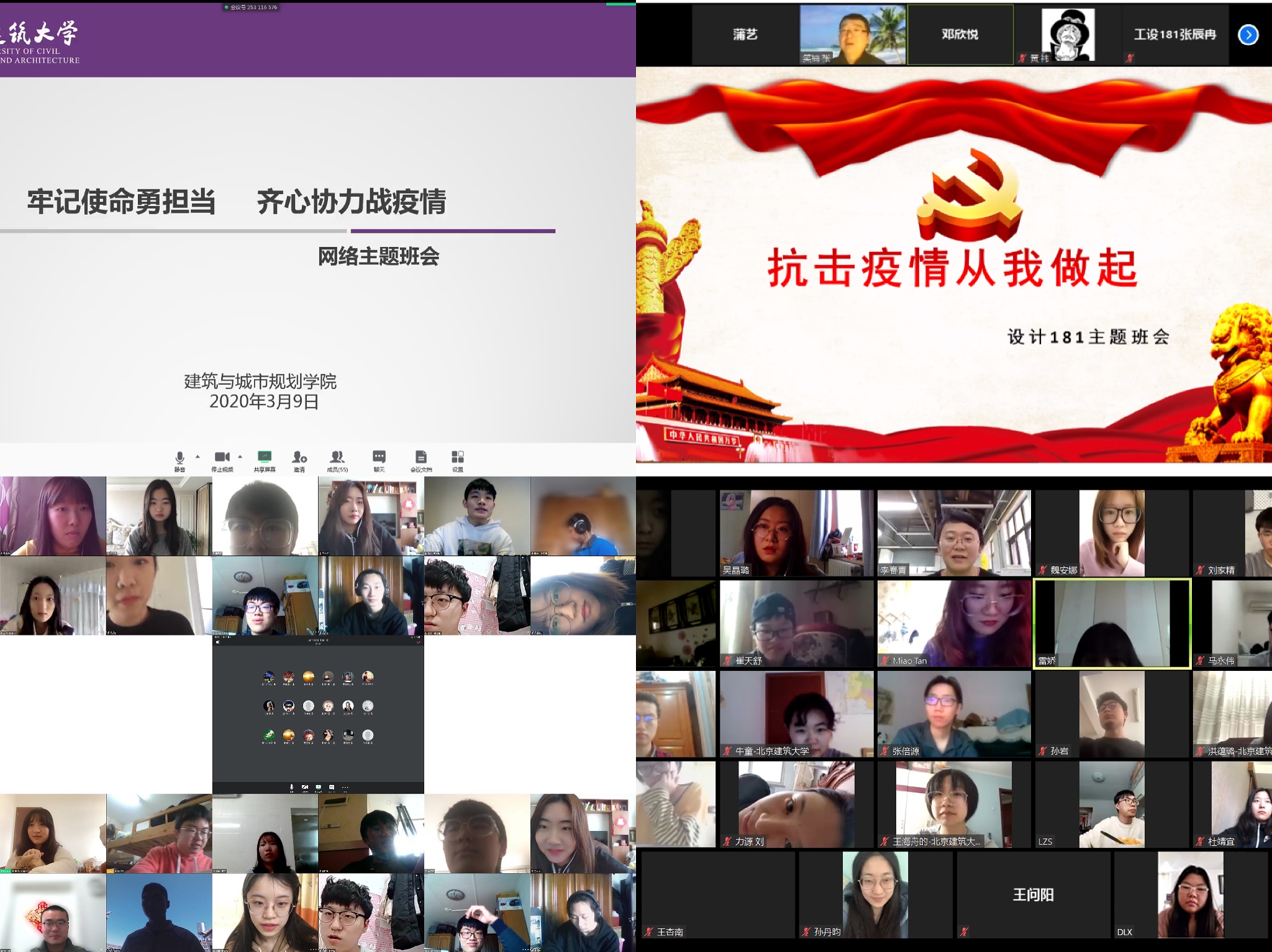 各班班会伊始首先进行了特殊的升旗仪式,全体同学起立,随着屏幕里国旗缓缓上升而唱起国歌。即使同学们身在全国各地,但建院学子的心以这种方式连在一起,在歌唱国歌中聚集信心和勇气,激发同学们防疫时期的爱国主义情感。