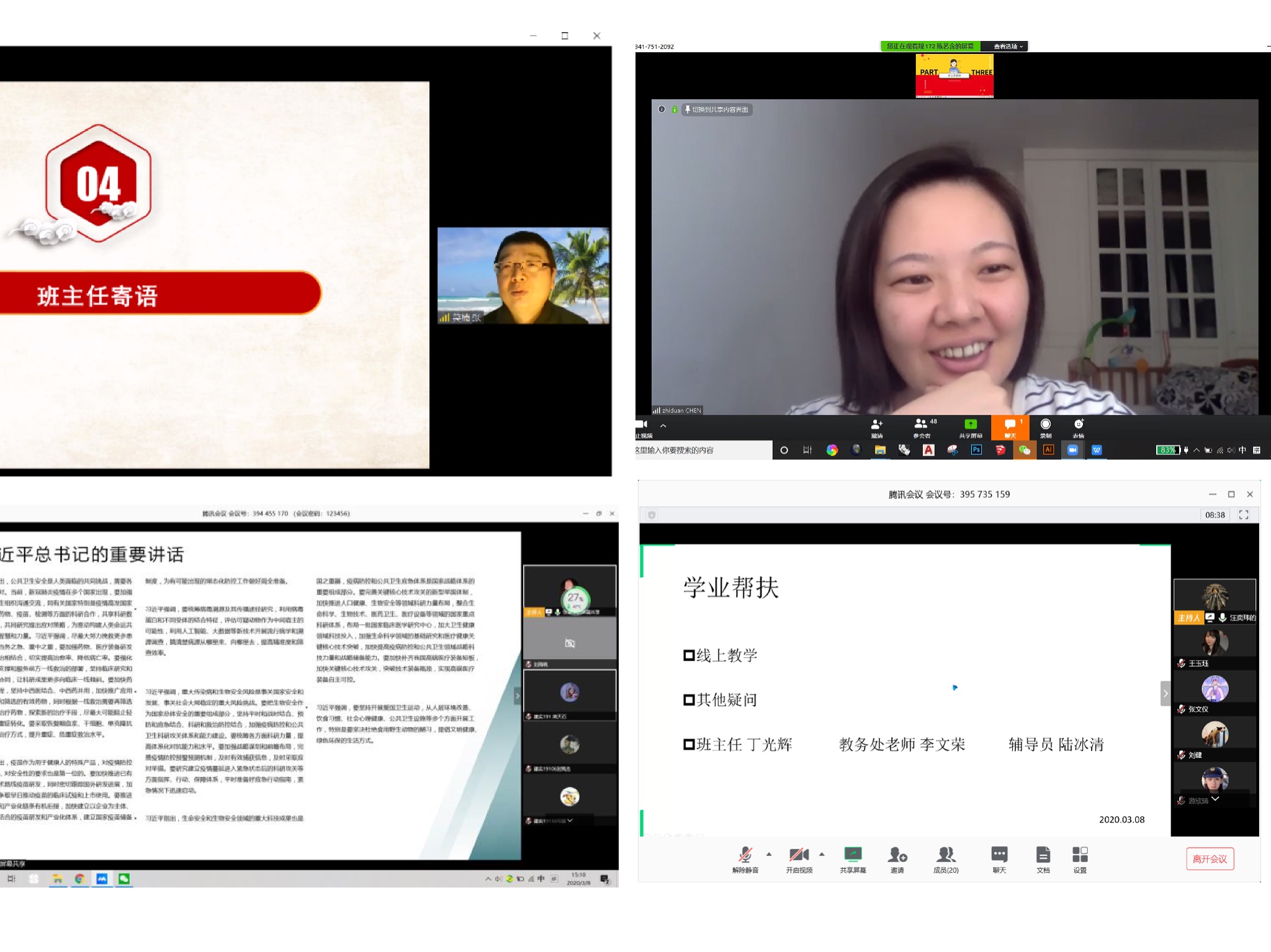 为贯彻落实习近平总书记关于新型冠状病毒肺炎疫情防控工作的重要指示精神,贯彻落实市委、市政府关于疫情防控的总体要求,落实公司党委应对疫情防控的工作部署,yl7703永利于2020年3月4日至12日组织全体员工班级开展以“牢记使命勇担当 齐心协力战疫情”为主题的网络班会,各班班主任、公司辅导员全程参与并进行指导。本次班会内容丰富充实,节奏紧凑有序,同学们认真听会并踊跃发言,纷纷表示收获良多。