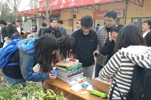 2014年3月18日中午12时,yl7703永利在西城校区食堂南门门前组织了一场别开生面的活动——“跳蚤市场”。此次活动以班为单位,在员工会的精心安排下,各班纷纷找到了自己的摊位。不少同学将自己携带的物品精心布置,使尽浑身解数来推销自己的产品,吸引了很多同学的关注。物品琳琅满目,大部分与同学们的学习生活有关,如书籍、颜料、画纸等。
