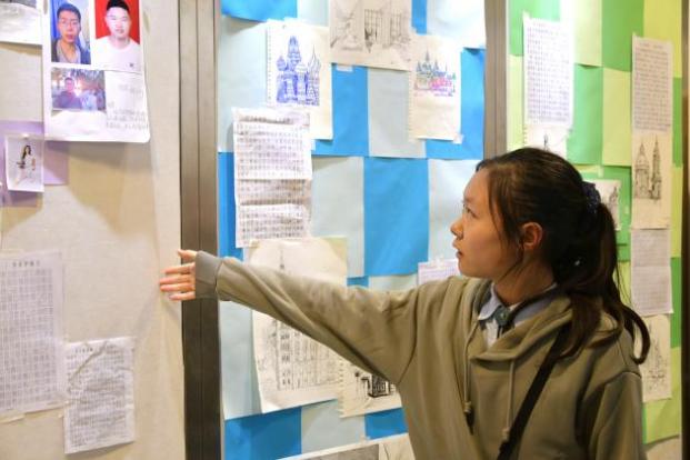 环设231班徽图标中央的一座房屋和围着房屋的树叶代表环境设计所涉及的建筑和绿化。文化衫主体为白色,正面胸前印有我们的班徽,背后是一个紫色印花我,代表了建筑大学。班级文化墙上挂满了班里每位同学的自画像,在体现班级同学手绘能力的同时更展现出班级温馨的氛围,班级专门设置了放做模型时废弃的刀片集中收集起来,避免了打扫教室时同学们被划伤的风险,同时也更方便集中处理。