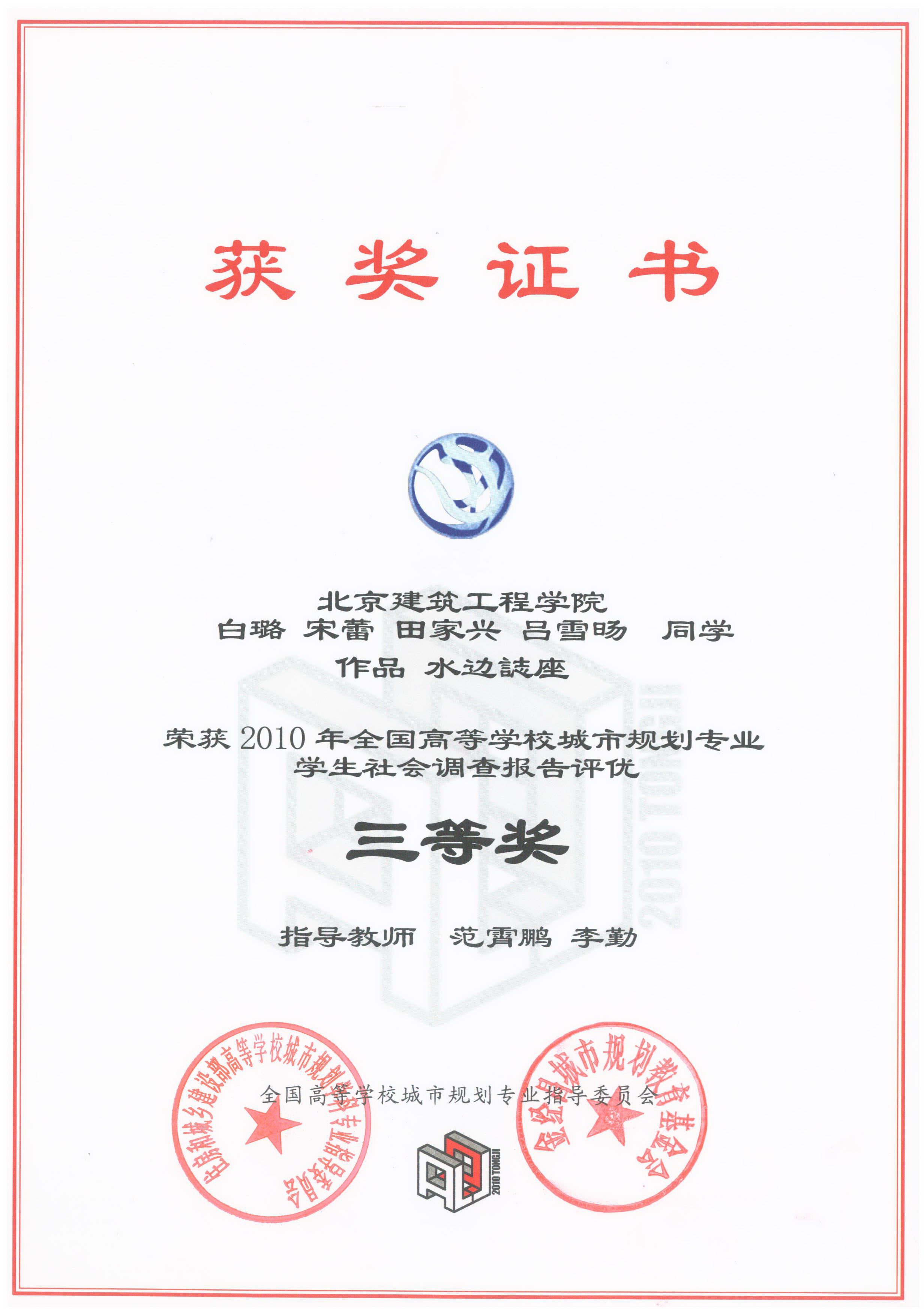 yl7703永利员工喜获2010年全国高等公司城市规划专业员工社会调查报告评优三等奖