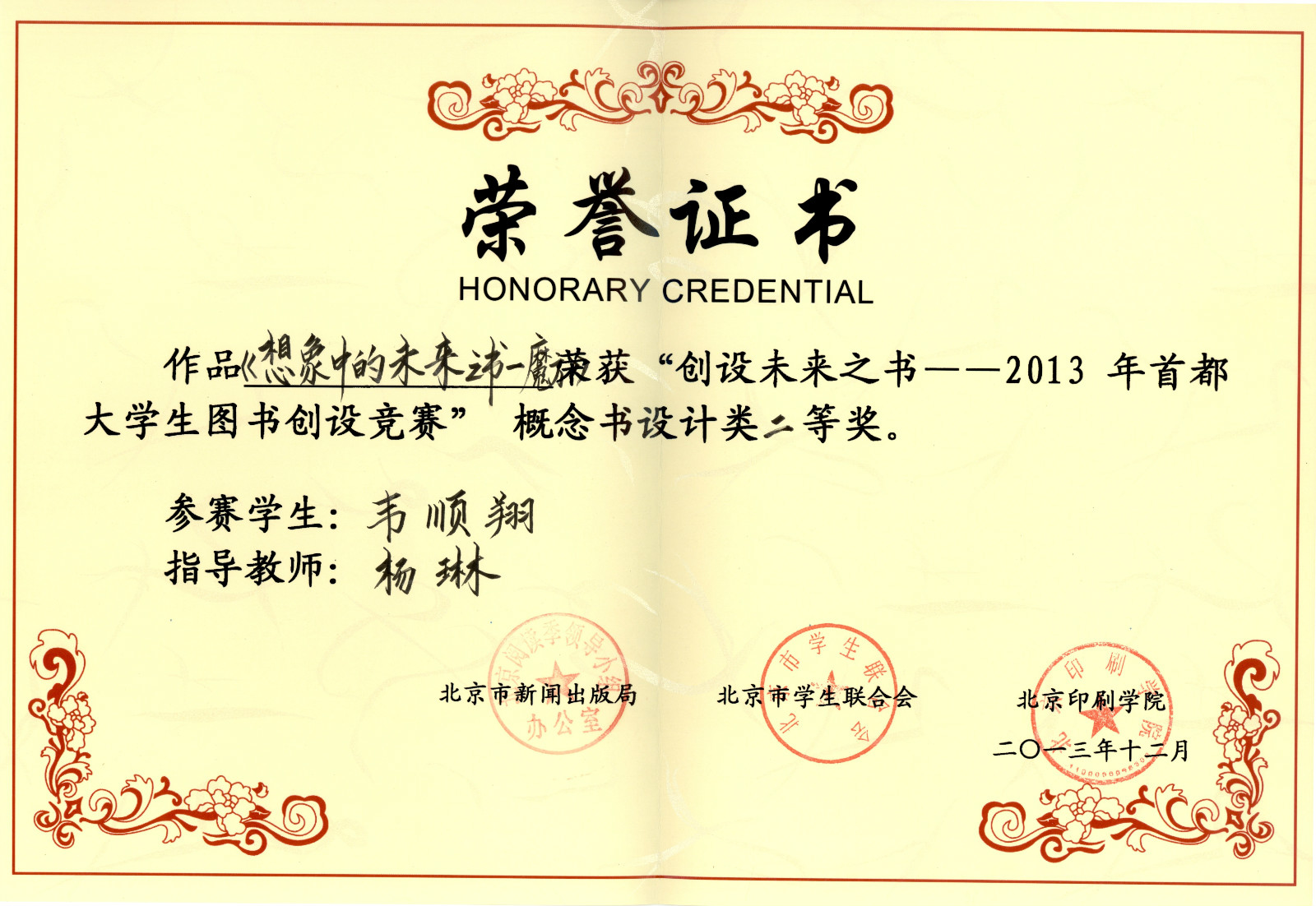 在刚刚结束的“创设未来之书”——2013年首都老员工图书创设竞赛活动中,公司yl7703永利工业设计专业10级员工韦顺翔荣获了本次大赛的二等奖。