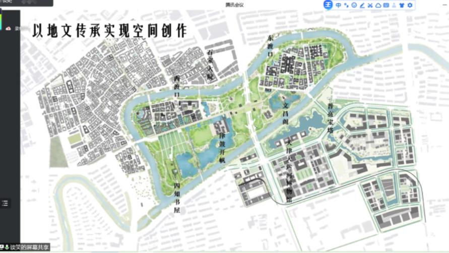 开题研讨会由开题介绍、开题交流、开题研讨三部分组成。首先,由出题方天津大学建筑设计规划研究总院谭啸所长对杨柳青大运河国家文化公园的项目背景进行了详尽介绍。2014年京杭大运河入选《世界遗产名录》,杨柳青作为沿运河两岸的“巨村“,承载了关于大运河南运河段的丰厚文化遗产与历史积淀。如今,大运河将作为国家文化公园重点建设项目之一,为运河文化的发展、运河两岸的活化利用提供了新的机遇。谭所长从杨柳青的历史脉络到民俗文化内涵,从非物质文化遗产、城乡建设、运河工程与自然环境等角度对运河进行多层次的文化解读,展现了运河文化“美的历程”。谭所长随后也对该地块已有的多轮设计进行简单介绍,如“以地文传承实现空间创作”、“文化学镇”等相关设计,为同学们对地块了解提供了更加开阔的视野。最后,谭经理结合已有工作提出了地块现状条件的详细信息与城市设计的刚性管控要求,如文物保护要求、核心保护区范围、建设地带的高度控制等等,并对本次联合毕设的成果表达期待与支持。