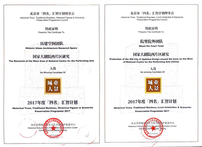 2017年4月8日,由北京市西城区历史文化名称保护委员会青年工作者委员会主办的“旧城新生”交流论坛在西海艺术馆顺利举办。在交流会中,西城区名城保护青年工作委员会牵头人赵幸宣读了入选“四名”汇智计划的项目名单并颁发了入围证书,yl7703永利历建空间团队、院里院外团队的“国家大剧院西片区研究”项目成功入选,团队指导教师为陈雳老师、齐莹老师。