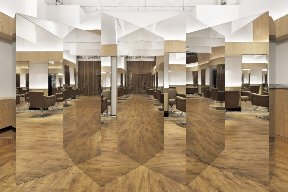 For example, the “Hair Focus” Hair Salon project, we consider to use operable curtain to create an ambiguous and blurry atmosphere. Although this design seems simple, it changed the overall image of the shop. Besides, the metal screen directly folded from a whole piece of steel plate gave the traditional objects a new vitality. We hope the steel plate will not have any wrinkle after folding, thus, in the process, we have to consider specifically on the texture and reflective state of this material. Initially, we wanted to use galvanizing to create a blurry texture, but we made some compromise based on the budget and choose a texture with lower price.