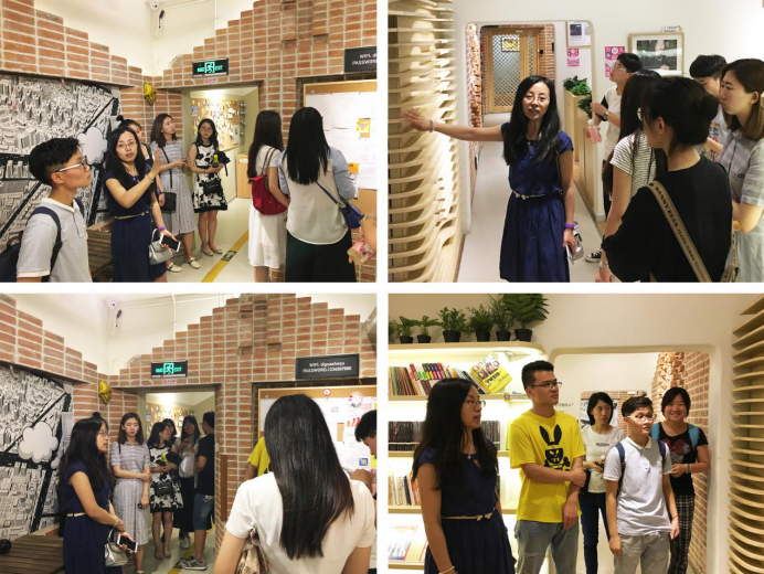 在“地瓜社区”实地调研中,阚玉德老师现场向同学们详细介绍了曾获2016年DFA亚洲最具影响力设计奖的设计团队的设计方案。“地瓜”是一家促进共享空间、意念甚至本地资源,旨在将空置的防空洞,改造成一系列共享文化空间,并以分享为轴。“共享”是未来设计的一个大方向。阚玉德老师鼓励大家要为人而设计,设计的目的是为人服务,只有达到真正的“共享”才能实现设计作品的最终价值。