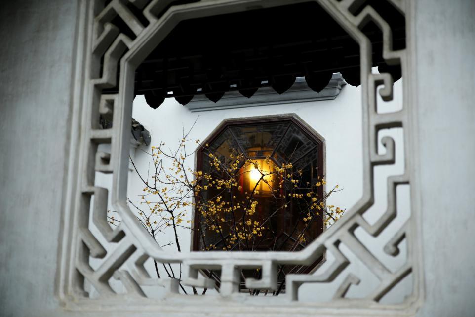 苏州园林里还有一点颇有意趣,在不少的园林之中,往往有着一处院子,一个屋子,其间陈列的不是刻画精细的家具或是制作精良的器皿,而是一盆盆的盆栽。盆栽此物,有假石有假山,细节之处无一不刻画得精细,植物更是修剪的颇有意趣。但是,在一处有着实景实物的园林之中为何要追求这种细化的微观之物?我想我从园林之中找到了答案。除了细微之处精工的雕刻,院中拐角的一颗盛放之树,精雕的木窗外一抹盛放的腊梅,在意趣横生的建筑拐角的一只独自盛放的花,屋檐下一支沾满了露水的枝头,一帧帧景色也塑造了苏州园林一种片段美,这在我看来也是苏州园林意趣中独有的一部分。