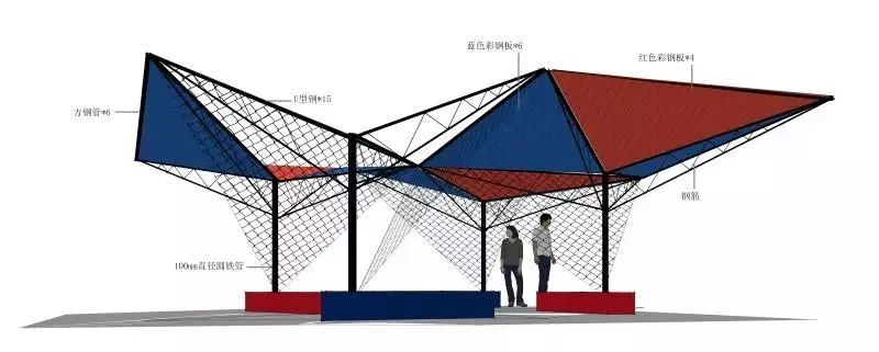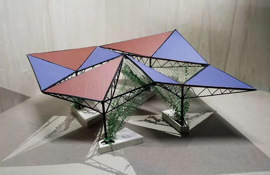 团队的另外一个作品,也在双年展期间受星空农庄的庄主何铮先生之邀在星空农庄的屋顶平台上实践出来。作品采用不同颜色的彩钢板和轻钢结构共同组建——红蓝彩钢板+爬藤网;遮阳休憩+雨水收集+屋顶绿化;农业+小工业。设计试图挖掘廉价材料潜在的美学意义和结构潜力,提供新的集会空间和复合型生态营造方式。