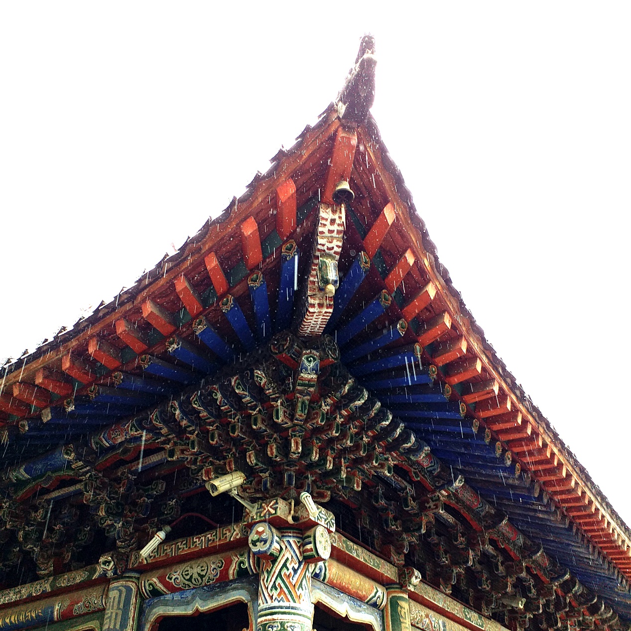 说不上是幸运还是遗憾,我们恰巧赶上了小雨。淅沥的细雨落在海拔3000米的寺前广场上,伴随着远处男孩叫卖青稞的吆喝,我终于看清了塔尔寺的全貌。期待中的佛寺,是在青石走道的约束下,精心规划对称排开的几大朱色楼阁。但眼前这群建筑,更像是一个依在莲花山脚下的精致村落。东北高地上的几行藏式平顶建筑是喇嘛们的住处。以僧舍为背景,从西南至东北又是一个略缓的下坡。平顶与飞檐一路交错,放射状围着北边的山排列到低地。复杂的藏红与简单的白色铺满了建筑,些许金色点缀在屋顶,最后,八座如意塔坐镇在入口。即使从相反的方向来看这寺院,也有着不俗的情调。