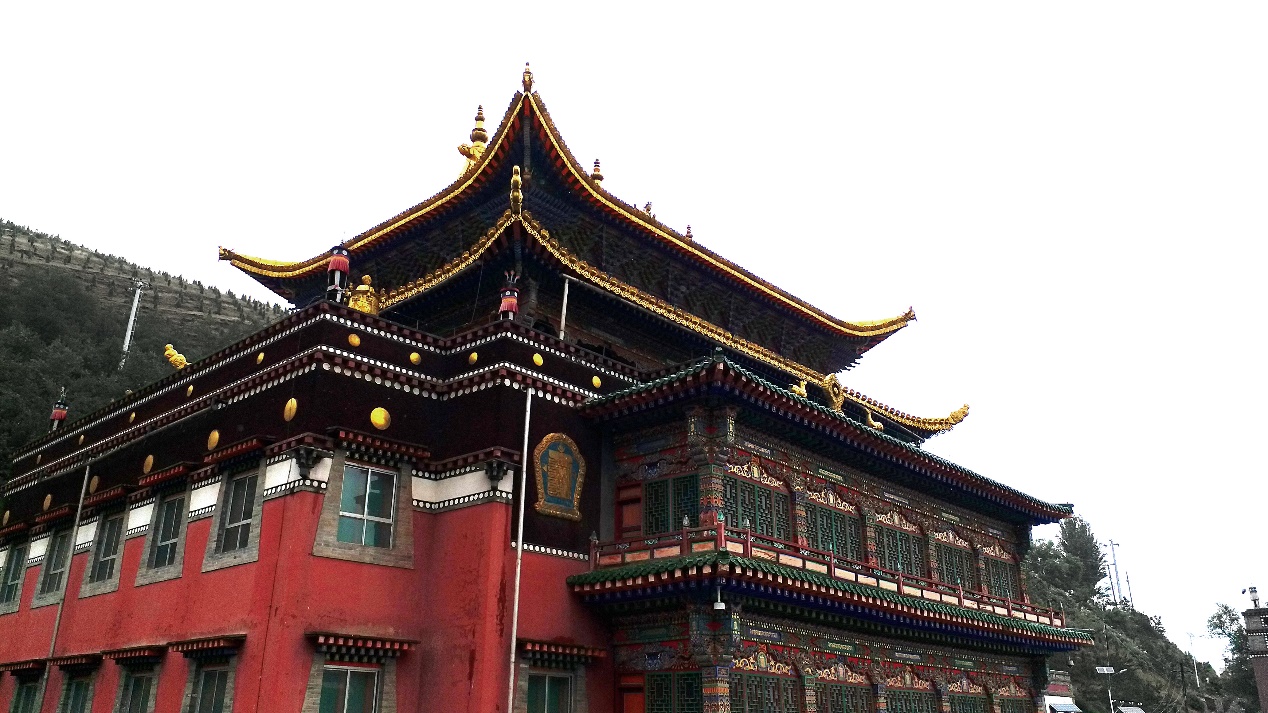 而寺院更能体现中原文化的影响。除大金瓦殿、弥勒佛殿和释迦佛殿等单体建筑之外,其它殿堂和普通建筑都是以合院形式表现的:四面用平顶封闭,到合院最重要的一个或两个建筑便改用硬山顶塑造出一个更宽敞的空间。如果合院为重要一点的大殿就会用上单檐歇山顶,甚至重檐。而之前提到的大金瓦殿和弥勒佛殿都是用的重檐歇山顶,能在十五世纪用上这样高级的屋檐形式,足以体现这些大殿的高级与重要性。然而在红蓝绿交相辉映的斗拱下,你并不会真的觉得自己行走在汉式建筑群中,目所能及的是彩布、经轮、红色麻墙等藏族元素,两种文化在建筑中有机得融合在了一起。
