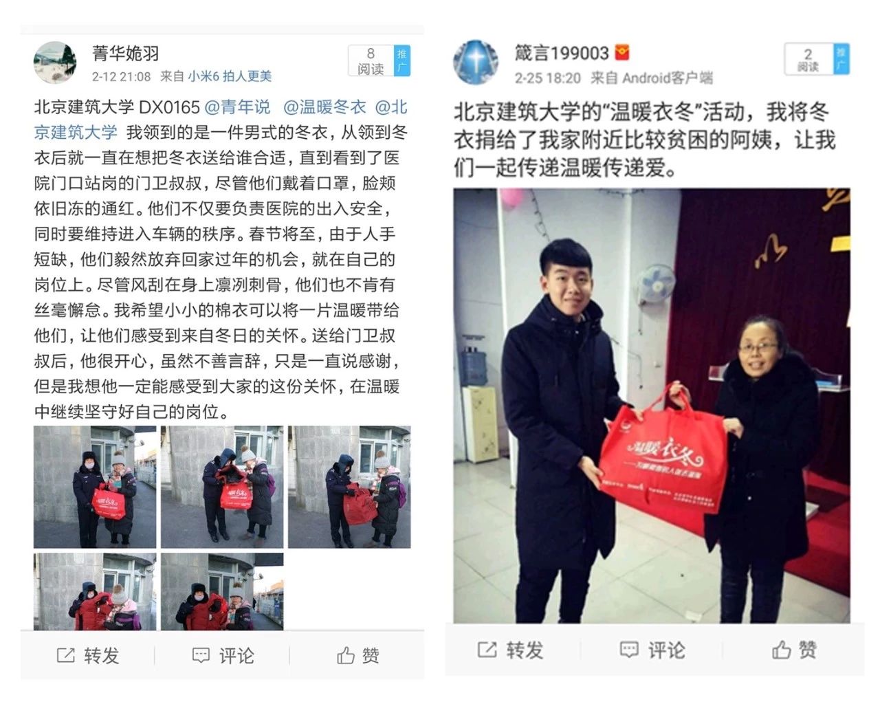 同学们在捐赠后记录下了捐赠故事和自己的感受,以照片的形式记录下温暖时刻,也有同学在微博微信上分享了这次活动,使温暖的种子播撒得更广,生根,发芽。下面是志愿者们的一些参与感受,由于篇幅限制进行了节选,更多志愿温暖故事请期待青协成果展。