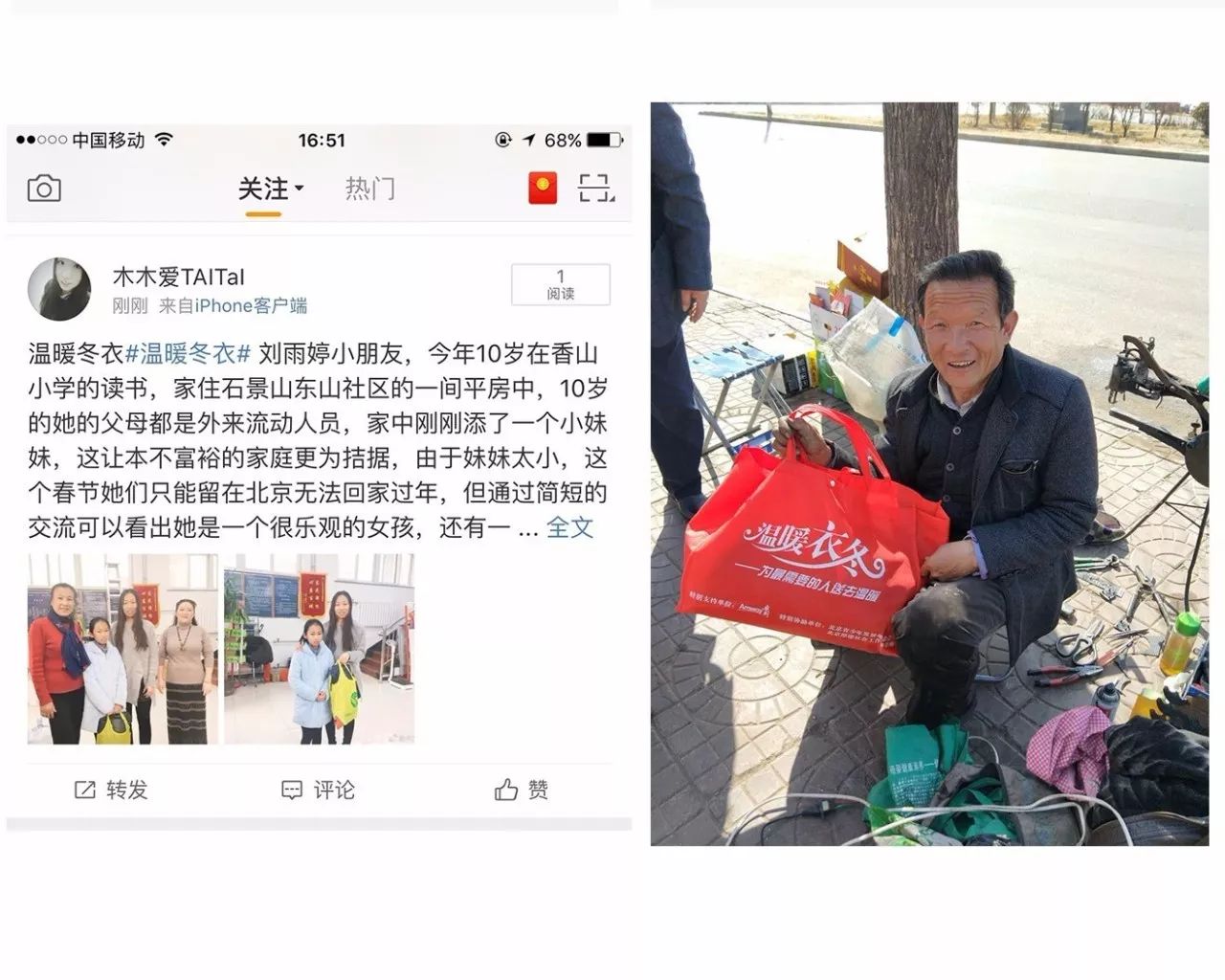 把衣服交到门卫大叔手中,我看到他的眼睛已经被风吹得盈满泪水,我希望小小棉衣中温暖,可以烘干他眼中的泪水,带给他们来自冬日的关怀。