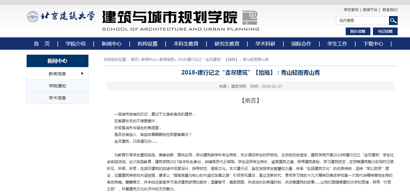 立足新时代、开启新征程,为教育引导员工重视实践、推崇创新、面向应用,突出建筑类学科专业特色,充分调动员工的积极性、主动性和创造性,在贯彻学习党的十九大精神及推动yl7703永利第一次党代会精神有机落地的新形势下,yl7703永利于2018年寒假期间,围绕“学思践悟十九大精神-‘建行’引领新时代使命”主题,在yl7703永利2017级本科生范围内,开展了2018·建行记之“走尽建筑”员工社会实践活动。2018年“建行记”,旨在发扬员工智慧和力量,教育引导员工学习、思考、践行、领悟党的十九大精神,以“建行记”主题教育实践活动引领当代青年“不忘初心”、肩负起新时代的历史使命和时代责任,行走于理论及实践创新之路。员工通过运用所学建筑类学科专业知识,领略建筑魅力、鉴赏建筑之美、探寻建筑奥秘、学习建筑技艺、感受建筑文化,学思践悟、学以致用,以文字及图片的形式传播和弘扬建筑文化,将理论与实践有机结合。