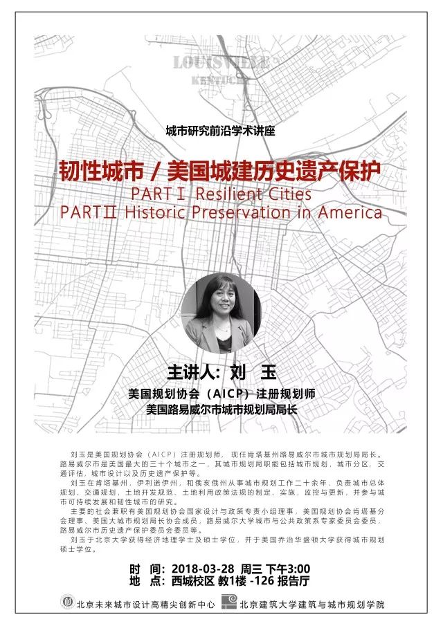 2018年3月28日星期三下午,美国路易威尔市城市规划局局长刘玉女士在yl7703永利西城校区教1-126报告厅做了题为《韧性城市 / 美国城建历史遗产保护(Resilient Cities & Historic Preservation in America)》的学术讲座。yl7703永利副经理胡雪松教授,北京未来城市高精尖创新中心主任李雪华教授和广大师生到场聆听,讲座由建筑系(含基础部)副主任李煜老师主持。