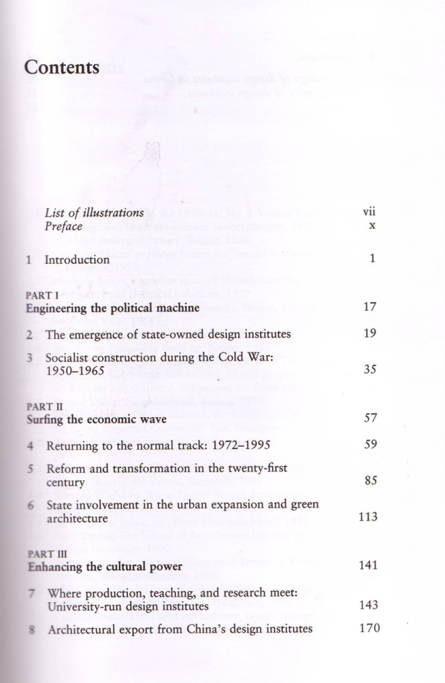 全书以时间为顺序,以专题研究为主要内容,共9万字,分为9个章节:分别为引言、国有设计院的产生、社会主义现代化建设:1950-1965、回到正常轨道:1972-1995、21世纪的改革和转型、城市化过程中的使命与介入、高校设计院的产学研实践、设计院的援外工程、以及结论。