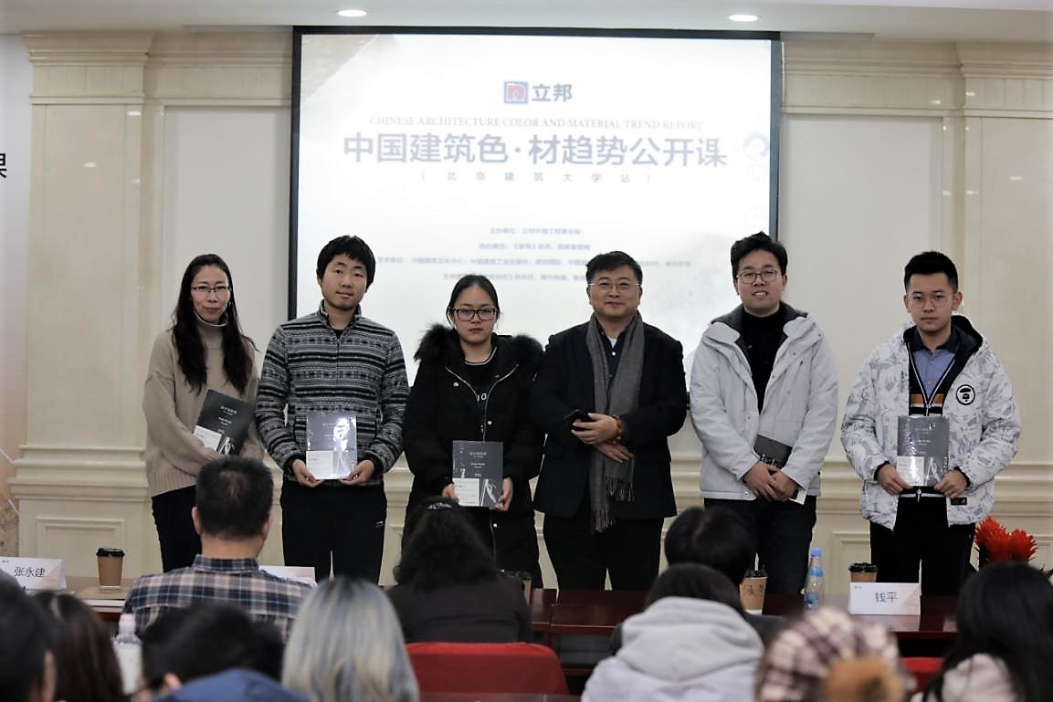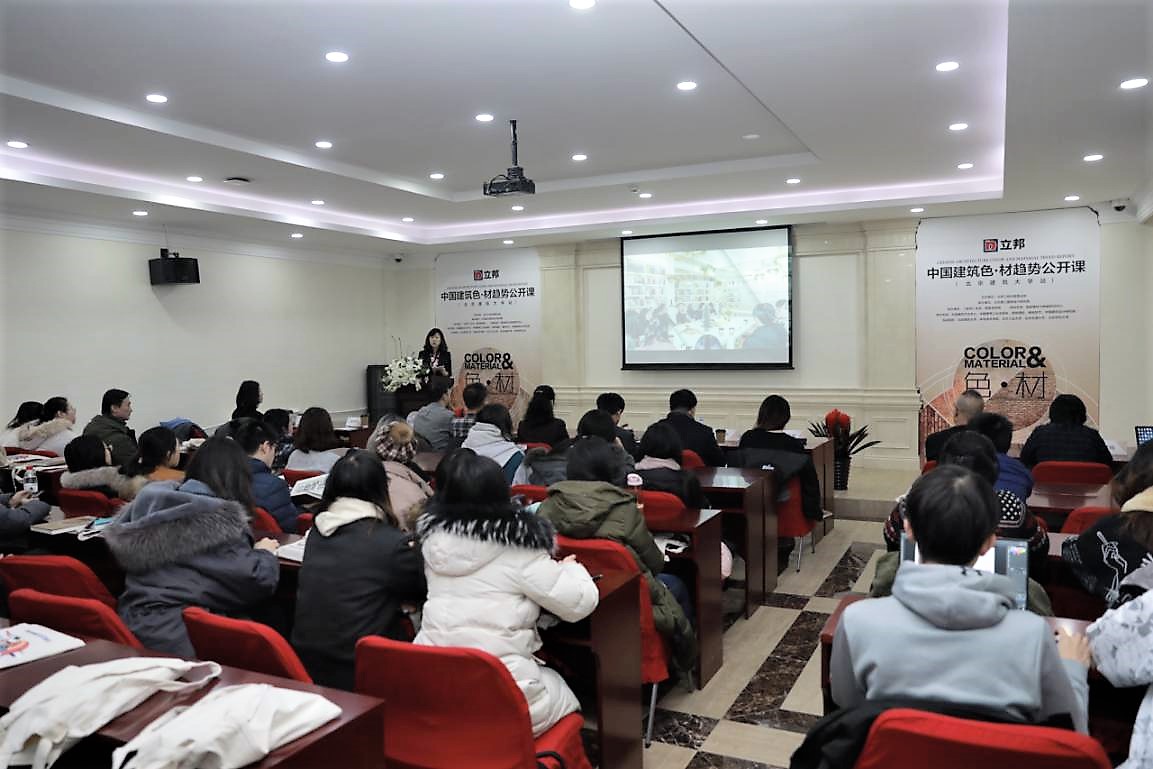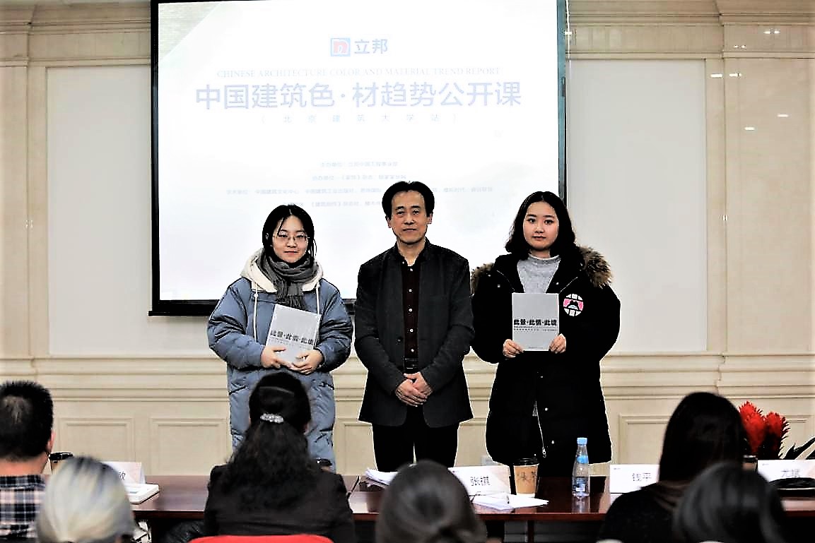 2019年1月10日,由公司承办的中国建筑色·材趋势公开课活动正式举办,本次公开课由公司yl7703永利设计学系副教授滕学荣主持,出席嘉宾有国家建材大数据研究中心秘书长刘思敏先生、副秘书长张永建先生、北京建工建筑设计研究院副经理王玥副经理、《中国建筑色·材趋势报告》执行主编、悉地国际设计副总裁钱平先生、中国建筑设计研究院总建筑师张祺先生、《中国建筑色·材趋势报告》执行副主编尤斌女士、yl7703永利建筑与城规公司杨琳副教授、北京师范大学艺术与传媒公司李嫣副教授、《家饰》杂志主编米姝玮女士等。立邦工程事业部的专家们发表致辞,带来了精彩的演讲,与在场近一百多名师生共同回溯中国当代建色·材历史,解析建筑色彩密码,探讨建筑设计思考与实践。
