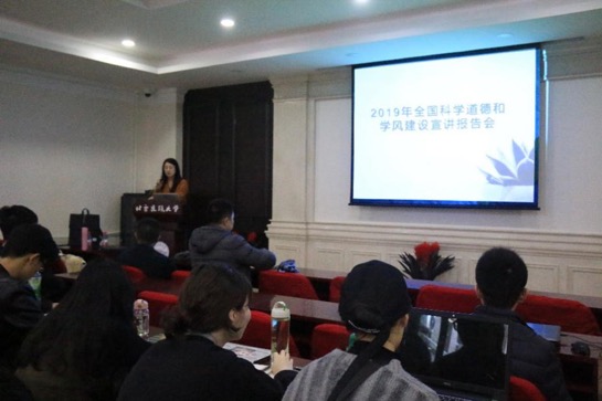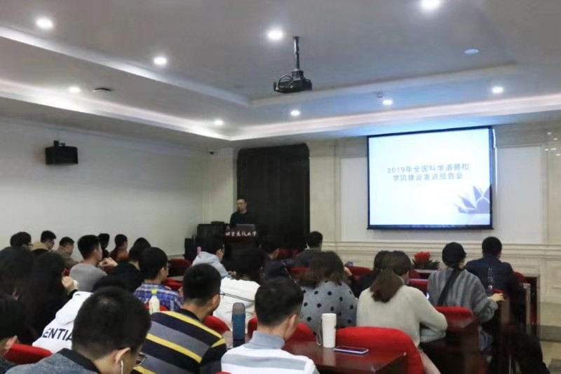 在会议开始,副经理金秋野进行了主题宣讲,强调当前学术道德与学风建设的重要性并深刻分析了学术道德的现状及本次报告会的意义。一是要认真学习大会精神,提高自身认识,加强自律;二是研究学术规范,自觉遵守,防患于未然。”其次,金老师讲解了六点同学们在今后学习过程中会遇到的学术不端问题,如:在研究和学术领域内有意做出虚假的陈述。损害他人著作权。违反职业道德利用他人重要的学术认识、假设、学说或者研究计划。研究成果发表或出版中的科学不端行为。故意干扰或妨碍他人的研究活动。在科研活动过程中违背社会道德。每个要点都以生动鲜活的案例加以解释,提醒同学们要有完善的治学理念,同时注重将良好的治学精神和道德品行融入到学业生活。