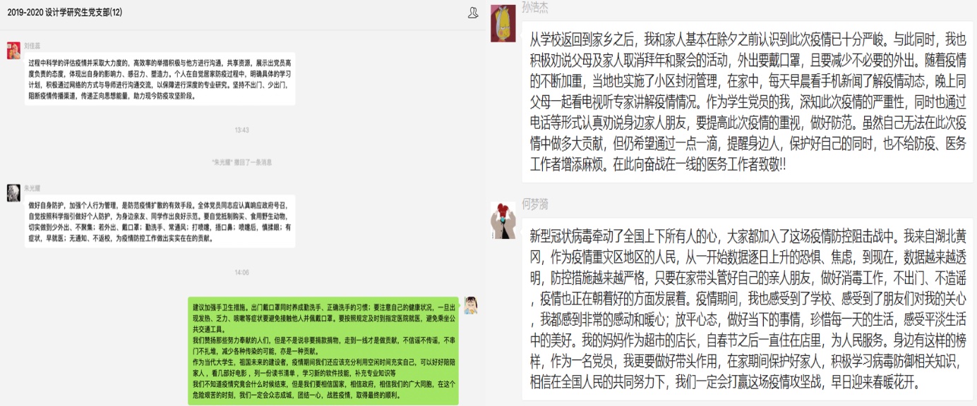 博士研究生党支部书记王阳谈到:“新冠肺炎疫情对我们来说是一场严峻的考验,对于员工党员来说,我们首先要做的就是严格遵守国家相关规定,执行上级党委的统一部署。这是考验党性是否坚定,是否能够发挥党员为人民服务精神的时刻。作为员工党员,要执行好党的任务,履行党员义务,通过宣传科学的防疫知识、努力进行科研学习等实际行动打好这场防疫攻坚战,为社会做出贡献。”