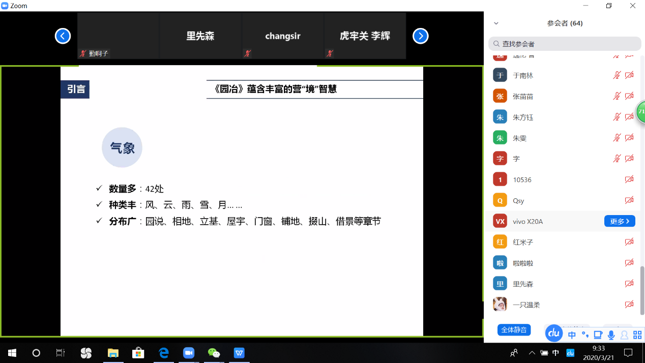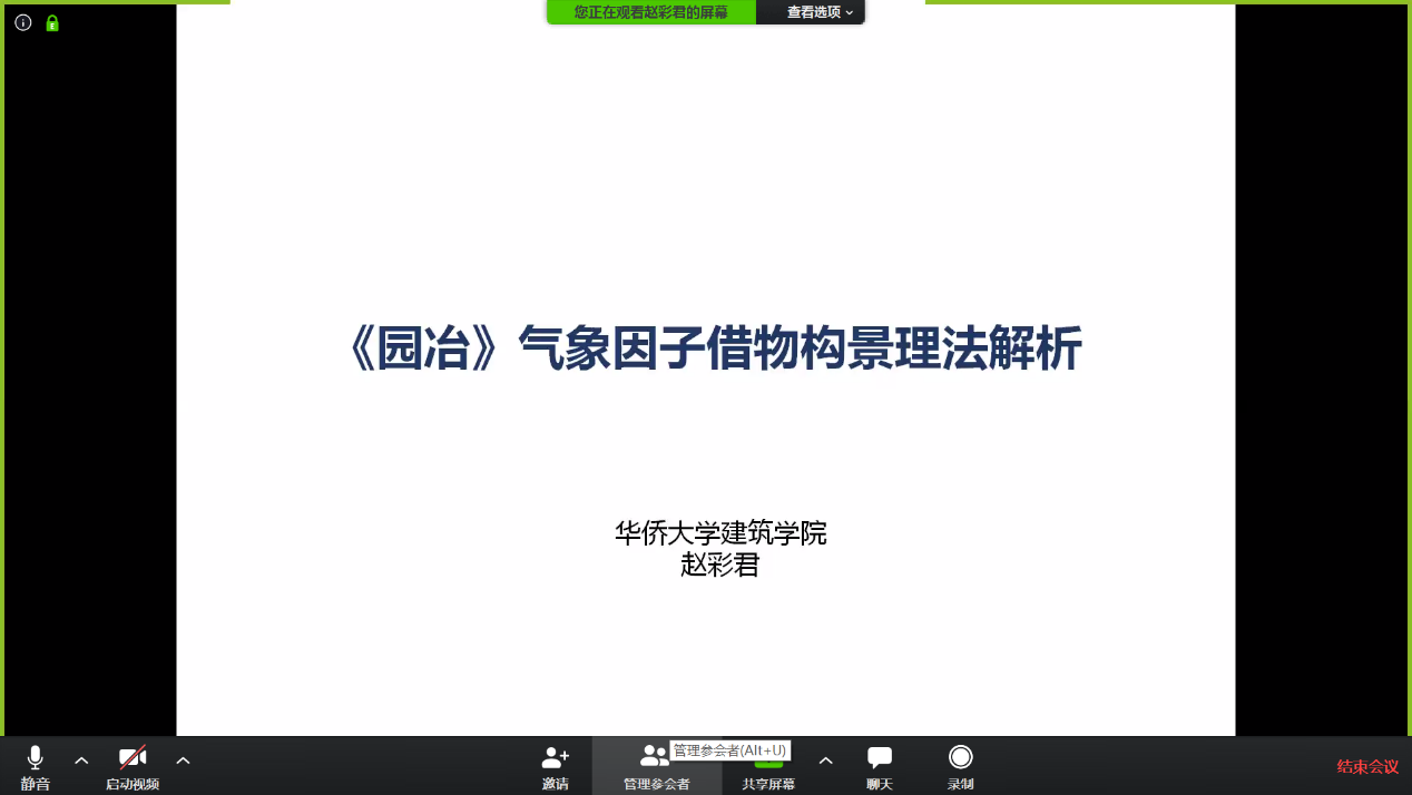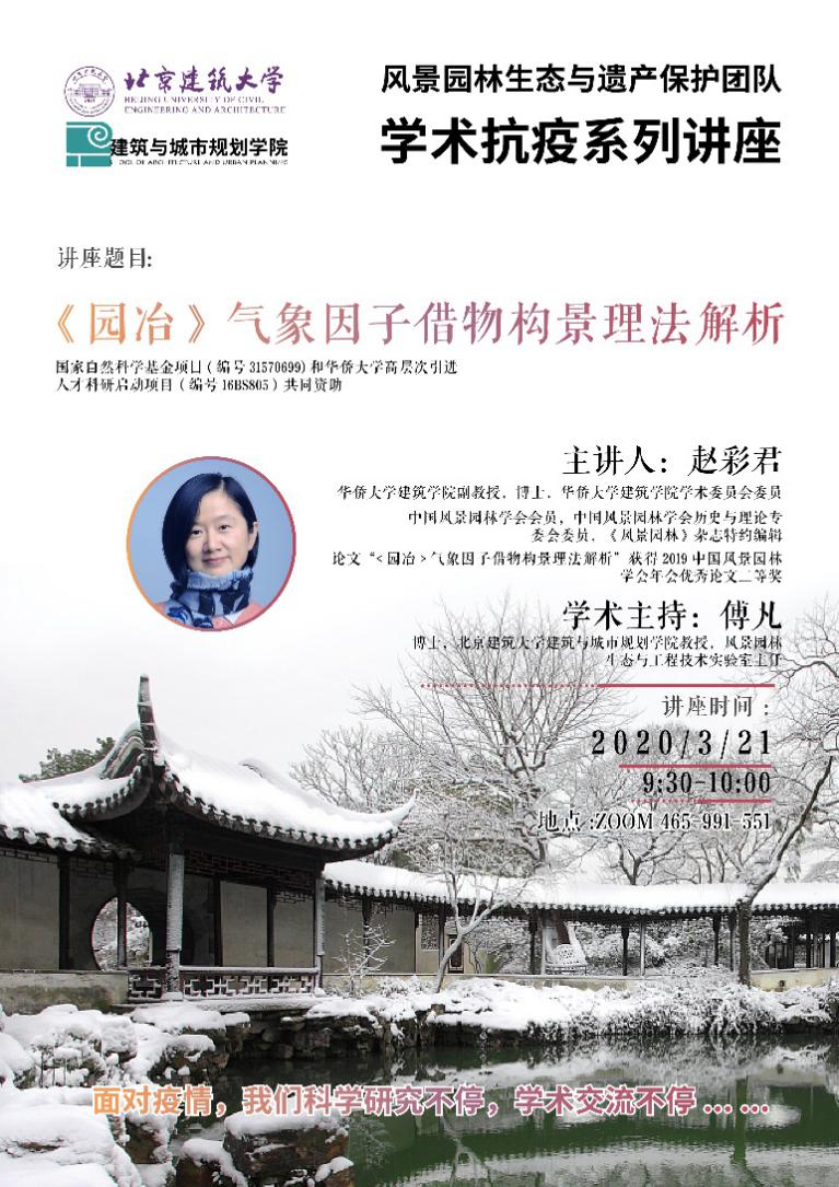 3月21日上午,华侨大学yl7703永利赵彩君副教授应邀在Zoom平台上与大家分享了以“《园冶》气象因子借物构景理法解析”为主题的讲座,公司师生和校外学者共80余人参与了本次线上学术交流活动。赵老师从《园冶》中蕴含的丰富的营“境”智慧谈起,通过梳理“境”的组成要素发现,气象因子是其中出现频率较高,且极富特色的组成部分之一。但由于它的虚幻性、多变性和速变性等特征,气象因子在营“境”过程中往往通过借物构景,与物质性构景要素共同构成园林虚实、动静、变换之美;随后,从自然和文化两个角度,解析了气象因子借山水、建筑、植物、动物、器具和活动构景的理法,最后,提出气象因子在营“境”中的功能,包括交代时间、烘托场景、人境交互、打造意境等。
