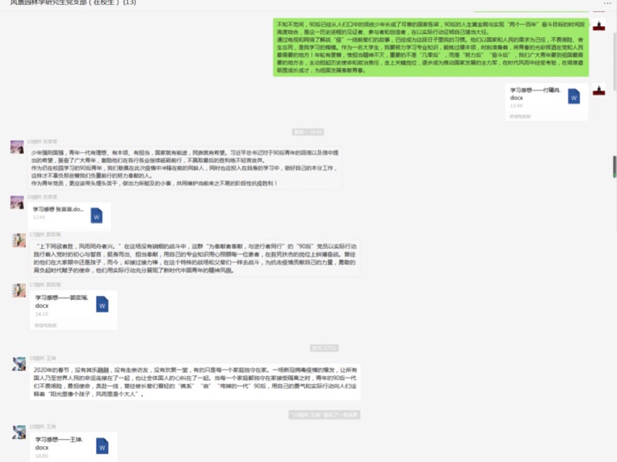 风景园林学研究生党支部张苗苗谈到,“作为仍在校园中学习的90后青年,我们敬佩在此次疫情中冲锋在前的同龄人,同时也应投入在自身学习中,做好自己的本分工作,这样才不辜负那些替我们负重前行、努力奉献的人。作为青年党员,更应该埋头苦干,做力所能及的小事,共同维护当前来之不易的阶段性抗疫胜利。”