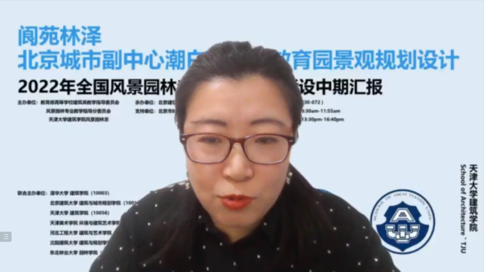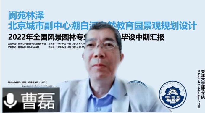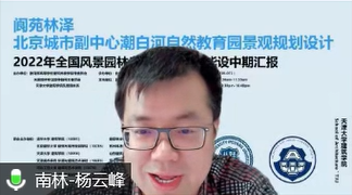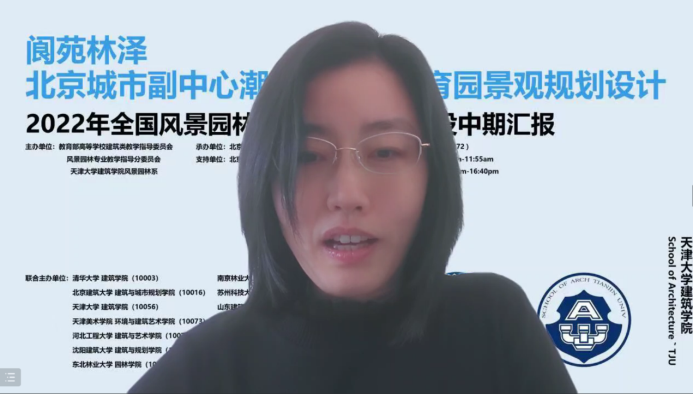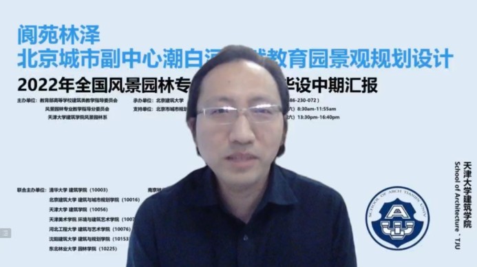 曹磊老师在致辞中表示对天津大学yl7703永利风景园林系可以承办“2022年全国风景园林专业10+高校联合毕业设计”中期汇报感到十分荣幸,也十分开心可以有这个同兄弟院校们加强交流和沟通的机会。强调了该选题高度契合风景园林当下重要的学科使命:如何在时代快速地变迁中为城市更新和可持续发展贡献智慧。曹磊老师希望各位同学可以通过这次城市区域景观规划与设计的实践系统地梳理并应用所学的知识、提高综合能力;各团队可以在这个平台上交流共享、百花齐放、碰撞出思维的火花;各个院校能够通过这个聚焦于区域更新、人民幸福、自然教育、生态涵养的“北京城市副中心潮白河自然教育园景观规划设计”课题展示各院校的办学理念和特色。