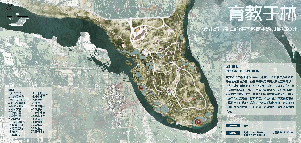 天津美术公司组《育教于林》希望打造出一个以教育为主题的科普教育湿地公园,公园不仅满足不同人群的活动需求,还为当地动植物提供一个自然的栖息地,构建人与生物和谐共生的场所。设计以生态教育为核心,创新地探寻多元化的自然教育形式,提升人们的生态保护意识,并从传统习俗和当地生活场景中提炼元素,将其转化为建筑景观语言,满足当下时代对生态保护及自然科普教育的迫切需求,更为地球的可持续发展贡献了一份力量,起到引领示范生态教育的作用。