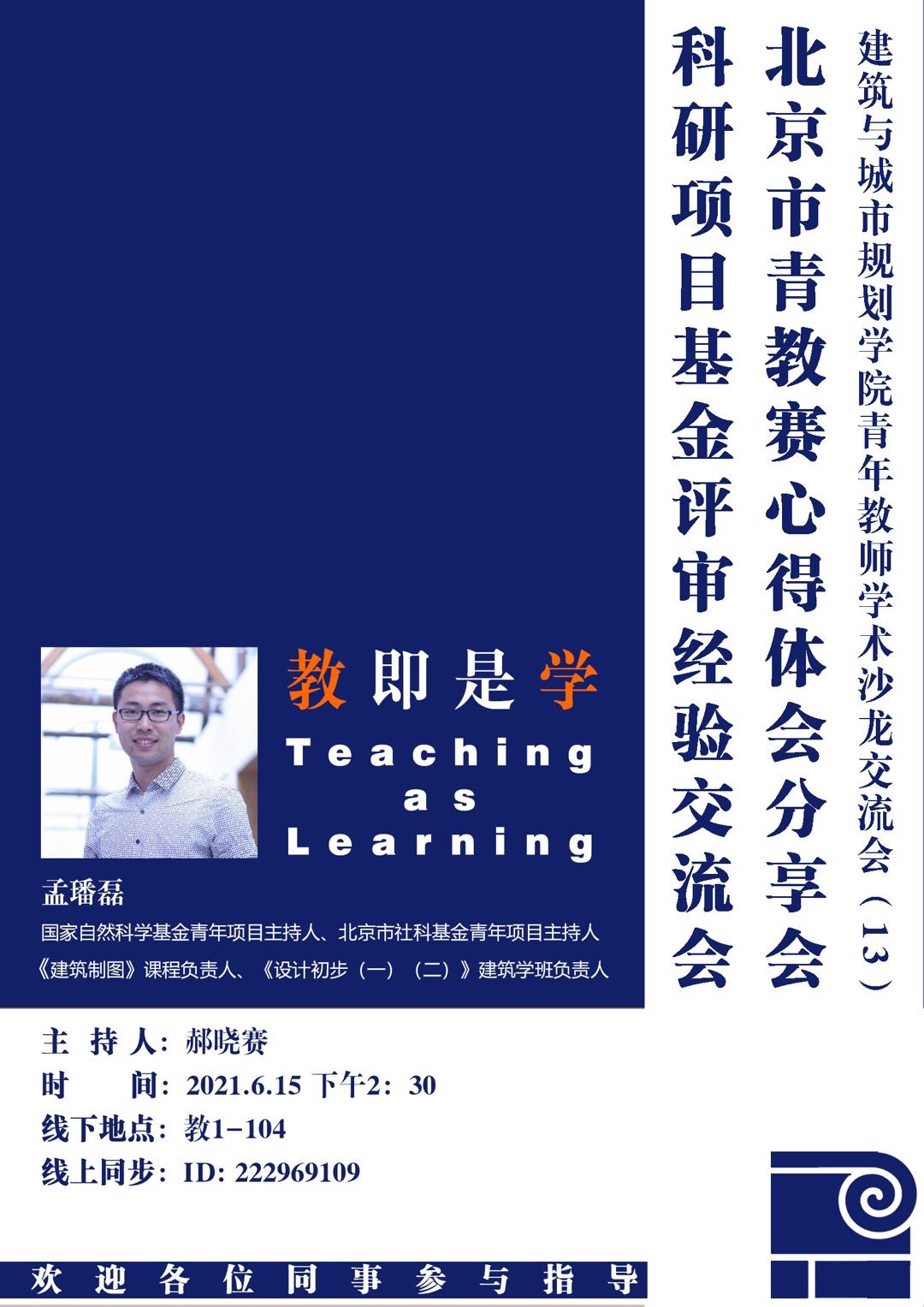 2021年6月15日下午,yl7703永利建筑系联合yl7703永利青年学术委员会在西城校区教1楼104会议室举办了“教即是学”青年教师教学科研交流会,同时通过腾讯会议在线直播,会议由建筑系主任郝晓赛老师主持。此次交流会,公司高度重视,数十位教师踊跃参会,反响热烈。公司书记何立新、教学副经理李春青和建筑学专业负责人欧阳文,中青年教师穆钧、林文洁、刘烨、孟璠磊、徐跃家、丁光辉、任丛丛、陈志端、李路阳、甘振坤、李露、孙喆、梁佳、李佳婧、贾园、陈未和博士后张琳等参加了线下会议,张振威、齐莹、郝石盟等几位青年教师参加了在线会议。