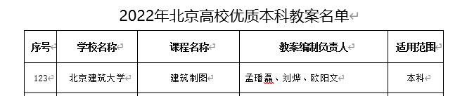 近日,北京市教育委员会下发《关于公布2022年北京高校“优质本科教案”评选结果的通知》(京教函〔2023〕47号),我院《建筑制图》课程教案,获评北京高校“优质本科教案”,教案编制负责人为孟璠磊。