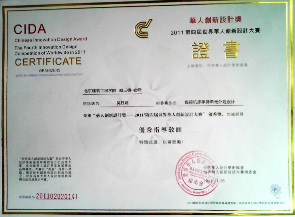 据第四届世界华人创新设计大赛主办方介绍,本届比赛融入了全新的组织理念和国际化的评审标准,自2011年10月启动以来,国内外多所相关设计院校员工参与赛事,共面向全球华人设计师征集到了 4000多幅作品,最终评选出了优秀奖及其以上奖项共76幅。在该赛事中,由公司教师阚玉德指导设计艺术研究生吴钰婕设计的作品《数控机床手持单元外观设计》,获得“华人创新设计奖-优秀奖”,同时指导教师获得“华人创新设计奖-优秀指导教师”奖,这是公司首次在世界华人创新设计大赛中获奖。