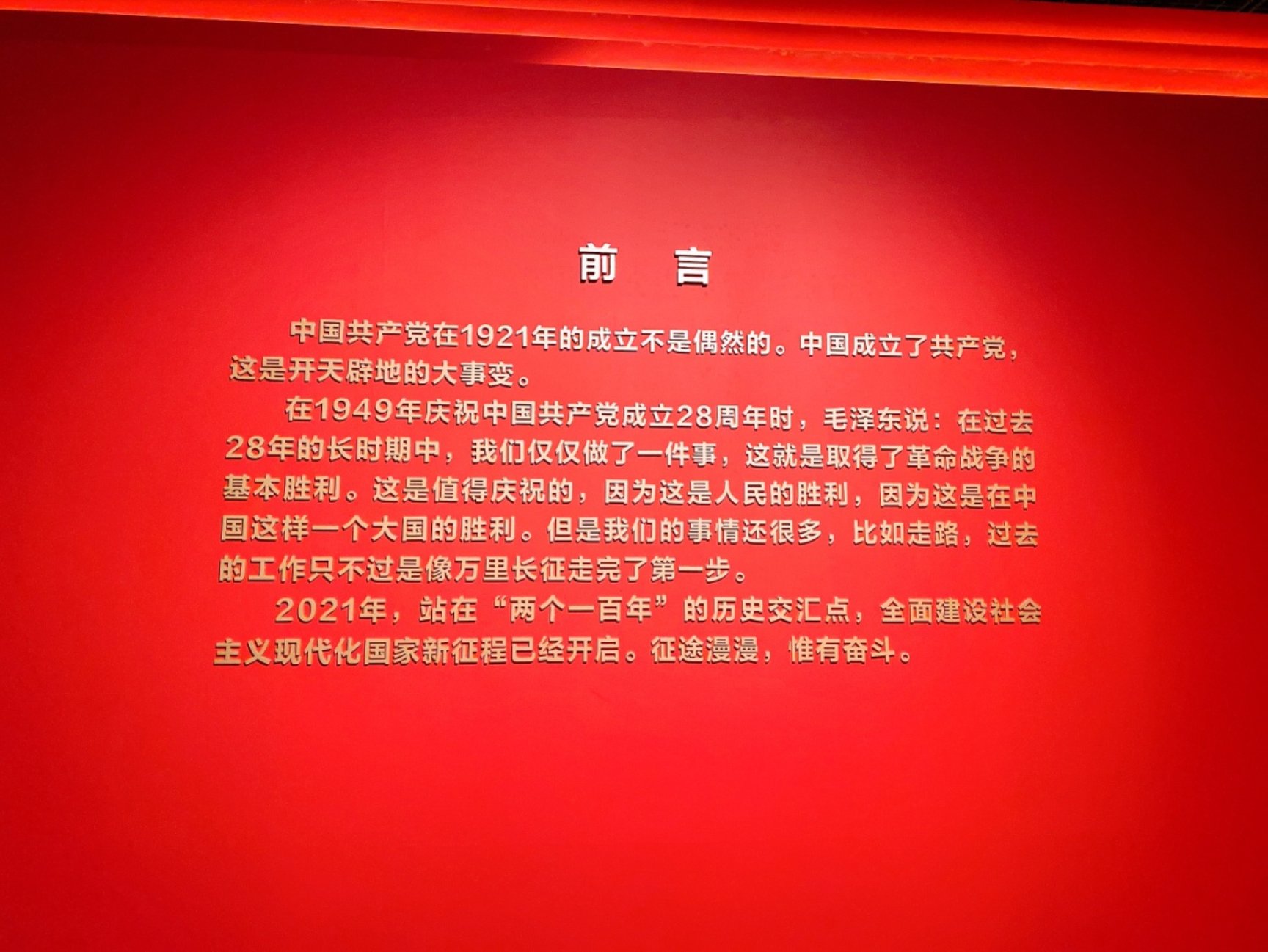 中国共产党在1921年成立不是偶然的,中国成立了中国共产党,这是开天辟地的大事实。在1949年庆祝中国共产党成立28周年时,毛主席说:在过去28年的长时期中,我们仅仅做了一件事,这就是取得了革命战争的基本胜利。这是值得庆祝的,因为这是人民的胜利,因为这是在中国这样一个大国的胜利。但是我们的事情还很多,比如走路,过去的工作只不过是像万里长征走完了第一步。