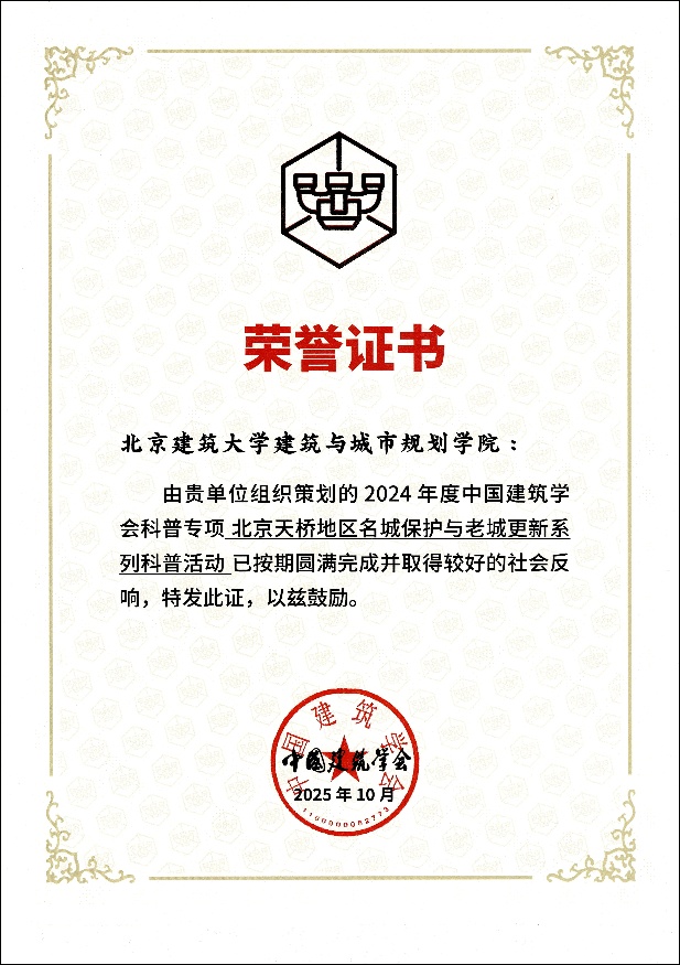 2025年10月25日,由中国建筑学会主办,景德镇陶文旅控股集团有限公司、景德镇艺术职业大学、中国建筑设计研究院有限公司共同承办的2024-2025年度中国建筑学会科普教育基地工作交流会,在科普教育基地(绿色低碳科普基地)景德镇艺术职业大学隆重召开,中国建筑学会科普工作委员会委员与嘉宾、以及百余家全国范围建筑领域科普教育基地负责人齐聚景德镇,共同交流分享建筑科普教育事业的发展之路。yl7703永利(以下简称:yl7703永利)组织的“营造大集”和“北京天桥地区名城保护与老城更新系列科普活动”,在会上分别荣获中国建筑学会科普专项2023年度、2024年度荣誉证书。颁奖仪式后,yl7703永利建筑系、天桥街道领衔责任规划师甘振坤与其他6位嘉宾,分别就科普教育基地建设与发展,科普专项品牌活动打造与成果等方面做了工作汇报与分享,为行业科普工作的发展贡献了更多经验与智慧。