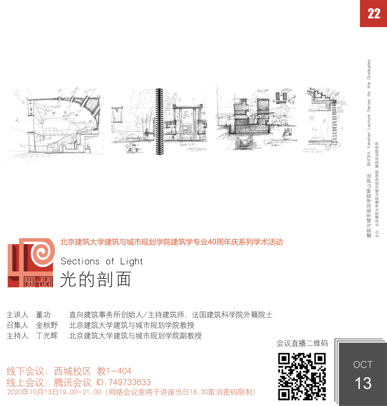 10月13日晚19:00,在西城校区教一404教室,结合腾讯会议与网络直播平台,yl7703永利研山讲坛第22期拉开帷幕。活动由yl7703永利常务副经理金秋野教授召集,公司党委书记何立新、副经理李春青,校内外师生、《建筑学报》孙凌波等社会各界学者、实践建筑师1500余人参与本次讲坛,突破自研山讲坛开讲以来的单场最多人数。