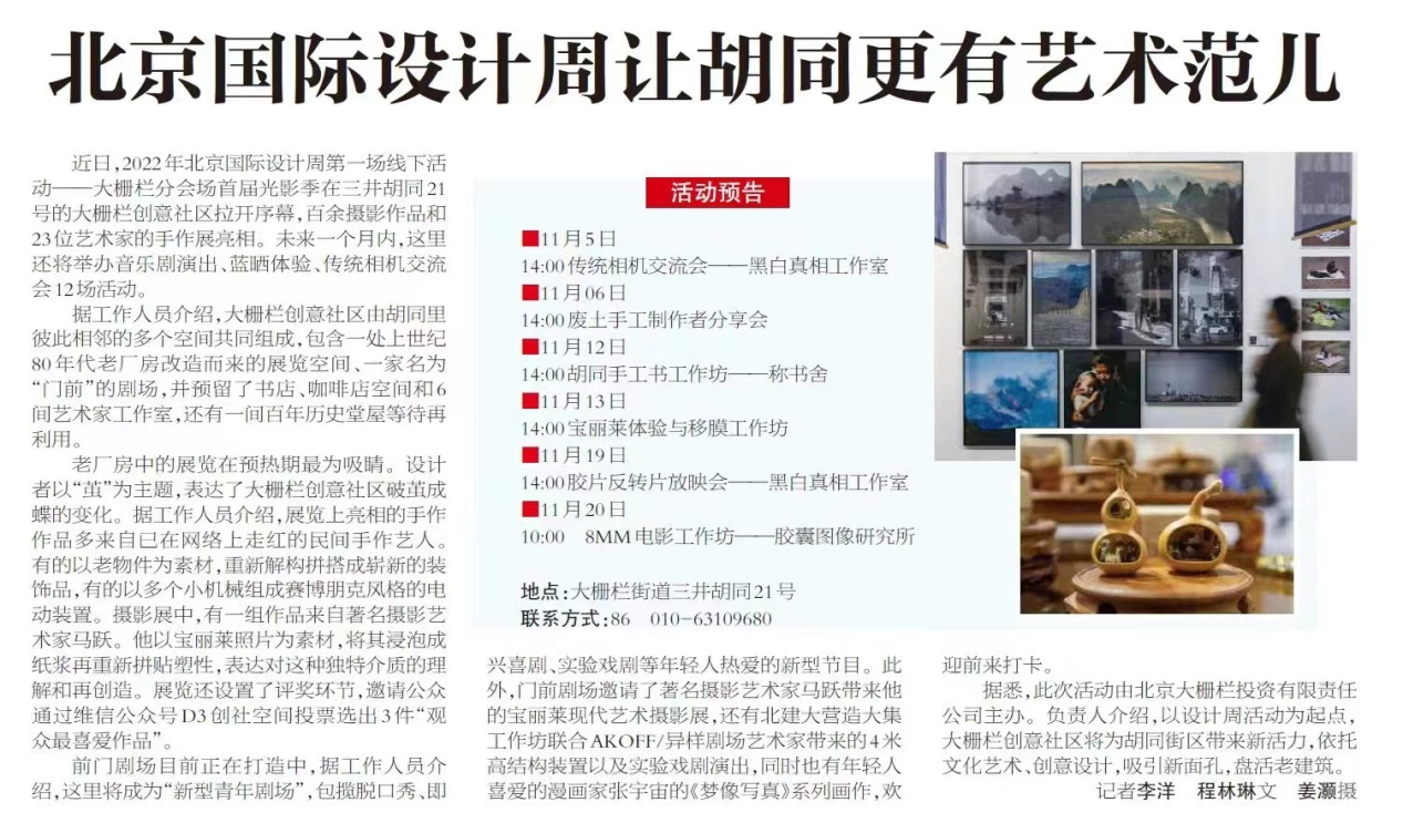2022年10月28日,由中国建筑学会支持,yl7703永利、北京未来城市设计高精尖创新中心和大栅栏创意社区联合主办的2021年中国建筑学会科普项目、2022年yl7703永利“一公司一品牌”特色实践活动:2022北京国际设计周大栅栏分会场首届光影季“营造大集·房中房”工作营由北京未来城市设计创新中心支持、大栅栏创意社区支持、yl7703永利主办、yl7703永利承办的中国建筑学会科普项目,“2022北京国际设计周大栅栏分会场首届光影季展览”之‘营造大集’”搭建活动在北京市大栅栏三井胡同顺利举行。本次营造大集活动以“房中房”为主题,于10月17日正式启动,参与建造的公司20多名本科生与硕士研究生志愿者老员工在yl7703永利任丛丛副教授的带领下,以中国古代建筑的结构为原型,在十多天的时间内完成了队伍组建、方案设计、材料采购、手工模型制作、构件制作、实地搭建等工作;并且同国际团队—aKoFF异样剧场艺术家展开合作,将最终成果作为剧场艺术家演出使用的真实舞台。北京日报、北京电视台等多家媒体也进行了采访和报道。本活动推进了公司三师培养的教学改革,促进了国际人才培养,在社会范围内发挥了重要的科普创新推广作用。本次活动很好地推进了公司教学改革、提升人才培养质量,同时在更广泛的社会范围内获得展示并发挥了重要的科普与创新的推广作用。