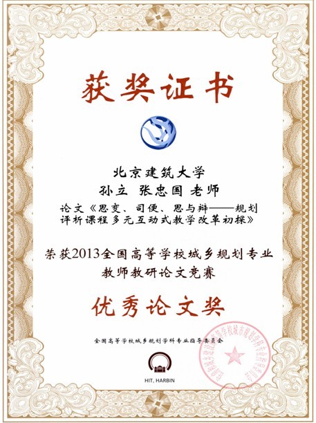 在专指委全体会上,还对今年的获奖作品进行了表彰。公司孙立、张忠国的教研论文《思变、司便、思与辨—规划评析课程多元互动式教学改革初探》获得优秀论文奖,并应邀在大会上作了宣讲;员工范金龙、赵洪民、李嘉宇、付乐的《“单停单行”方案分类深化》获得城市交通出行创新实践竞赛三等奖,指导教师是范霄鹏;员工李静岩、王潇的《摇滚七巧板》获得城市设计竞赛佳作奖,指导教师是孙立、苏毅;员工王煦立、李晨卉的《倏忽怡然》获得城市设计竞赛佳作奖,指导教师是苏毅、孙立。