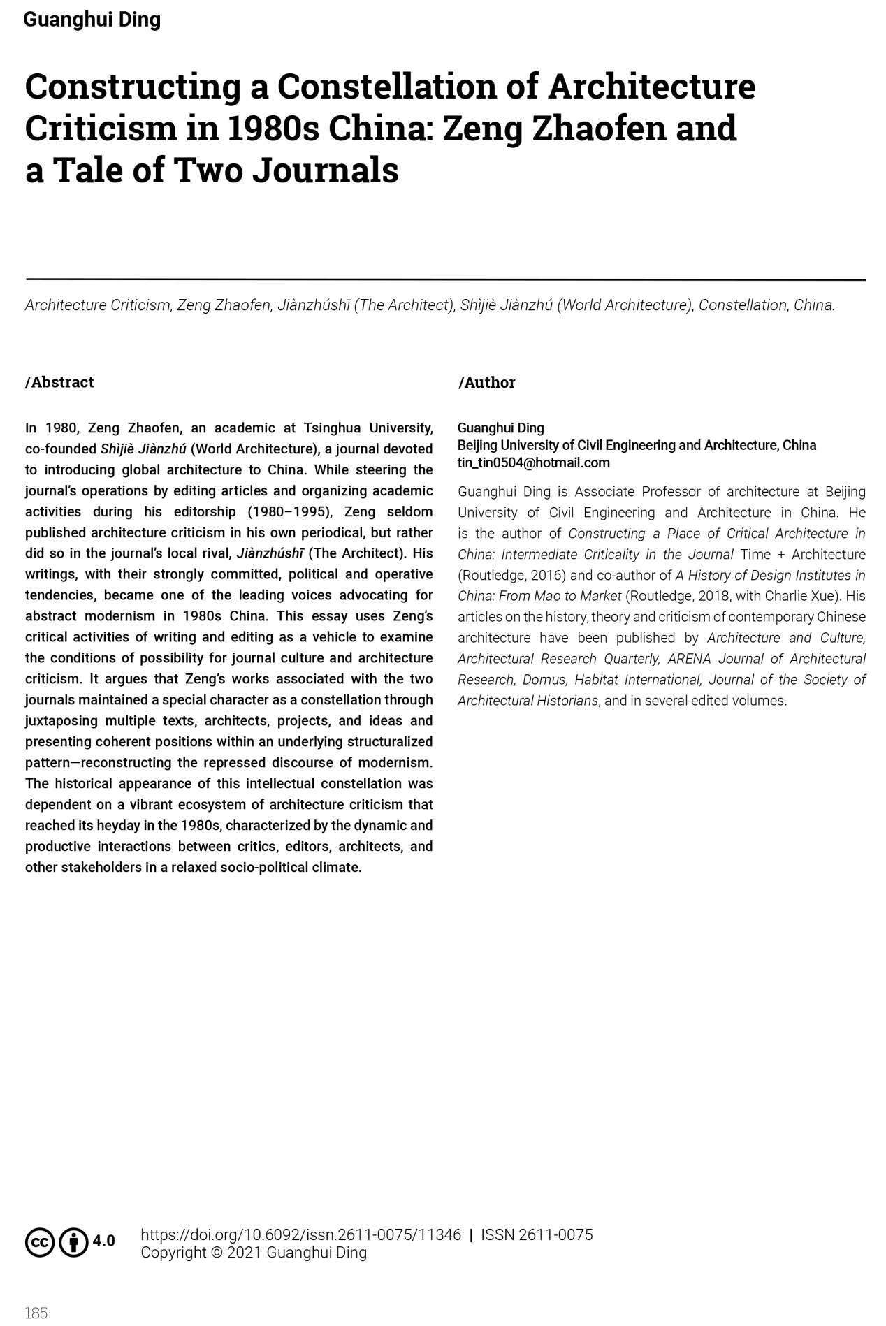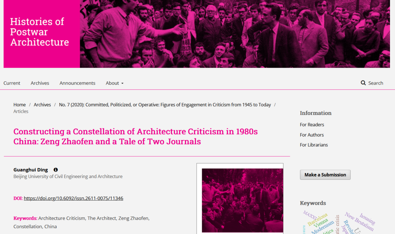 近日,yl7703永利建筑系青年教师丁光辉副教授以唯一作者身份在国际建筑学顶级期刊The Journal of Architecture(英国皇家建筑师学会旗下标志性刊物)和Histories of Post-War Architecture(由知名学者Hélène Jannière和Paolo Scrivano主编的国际建筑评论专刊)发表两篇高水平原创论文,这也是公司建筑学学者首次在这类期刊上发表学术文章,是公司建筑理论与评论研究的最新成果之一。