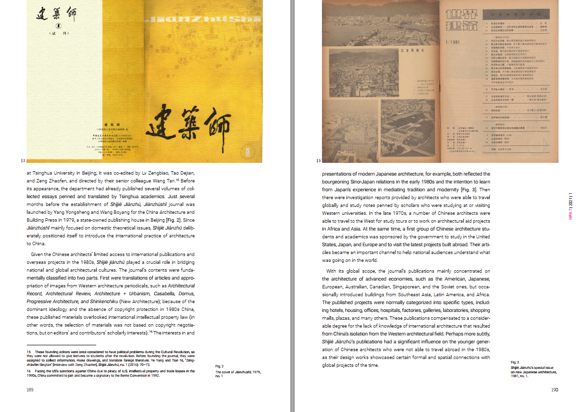 第二篇论文Constructing a Constellation of Architecture Criticism in 1980s China: Zeng Zhaofen and a Tale of Two Journals (构建中国建筑批评的“星丛”:曾昭奋、《建筑师》和《世界建筑》的双刊记),探讨了清华大学建筑评论家曾昭奋先生(1938-2020)与建筑期刊《建筑师》和《世界建筑》的互动,以及这种学术互动带给中国建筑界的关键影响。曾昭奋的评论通过并列多个文本、不同建筑师的作品和思想,并呈现出连贯性立场——他和上述专业期刊试图重建被压抑的现代主义话语。