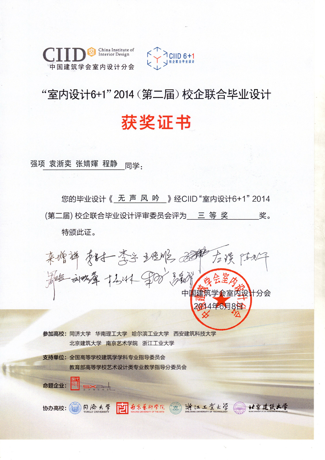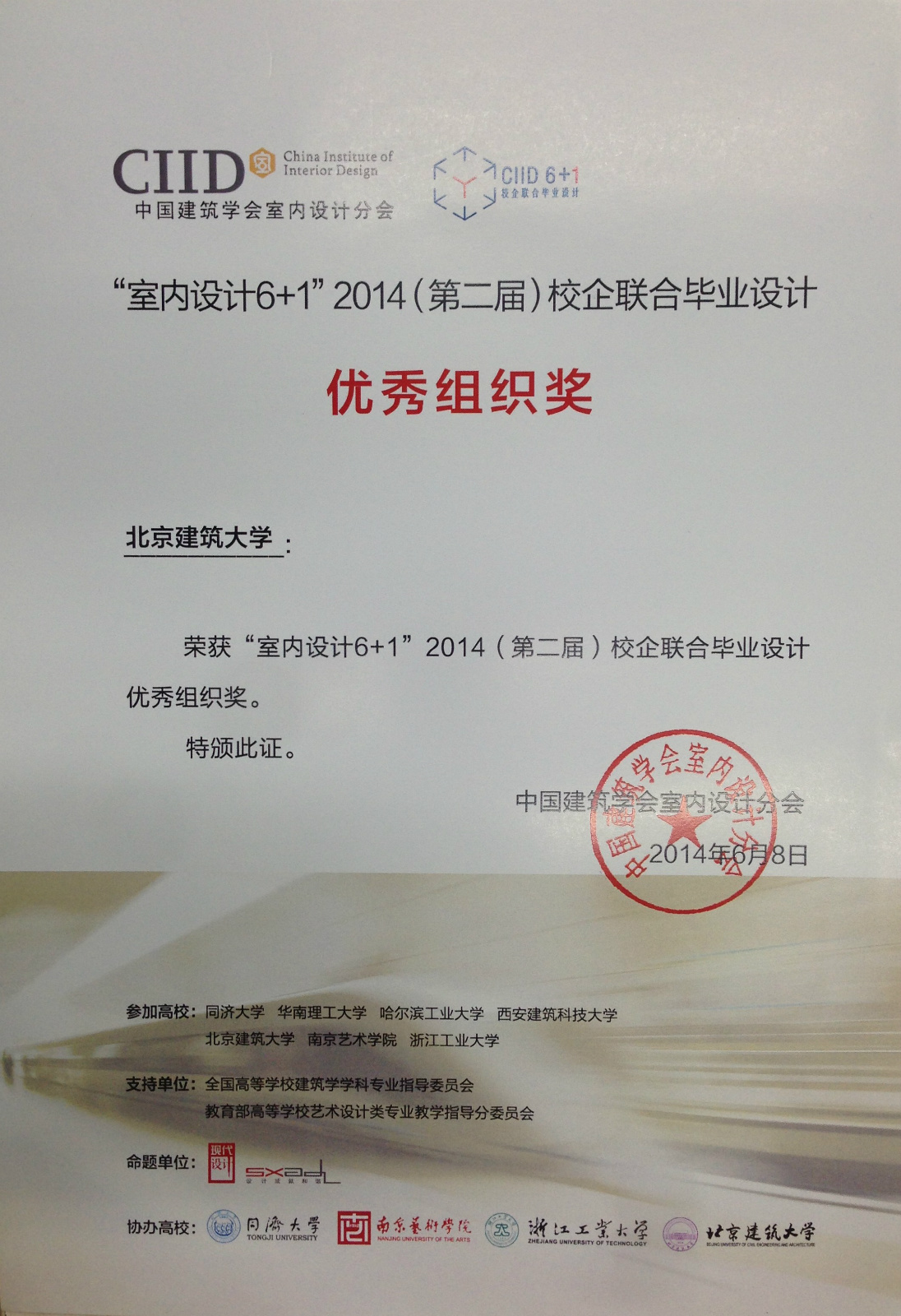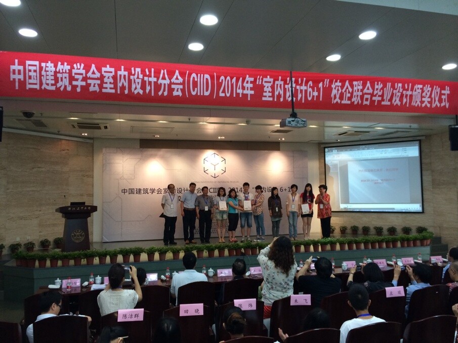 2014年6月8日, 中国建筑学会室内设计分会CIID 2014(第二届)“室内设计6+1”校企联合毕业设计答辩和颁奖活动在浙江工业大学屏峰校园举行,来自同济大学、华南理工大学、哈尔滨工业大学、西安建筑科技大学、yl7703永利、南京艺术公司、浙江工业大学的七所高校,涉及建筑学、环境设计、工业设计和展示设计多个专业的50多位应届毕业班员工共计23组设计方案,经过长达3个多月的思考及创意历程,均在最终答辩及展览中呈现了完整并各具特色的设计作品。专家评委组组长、同济大学来增祥教授为本届活动做了总结与点评。评委会最终评选出一等奖4名,二等奖8名,三等奖11名。