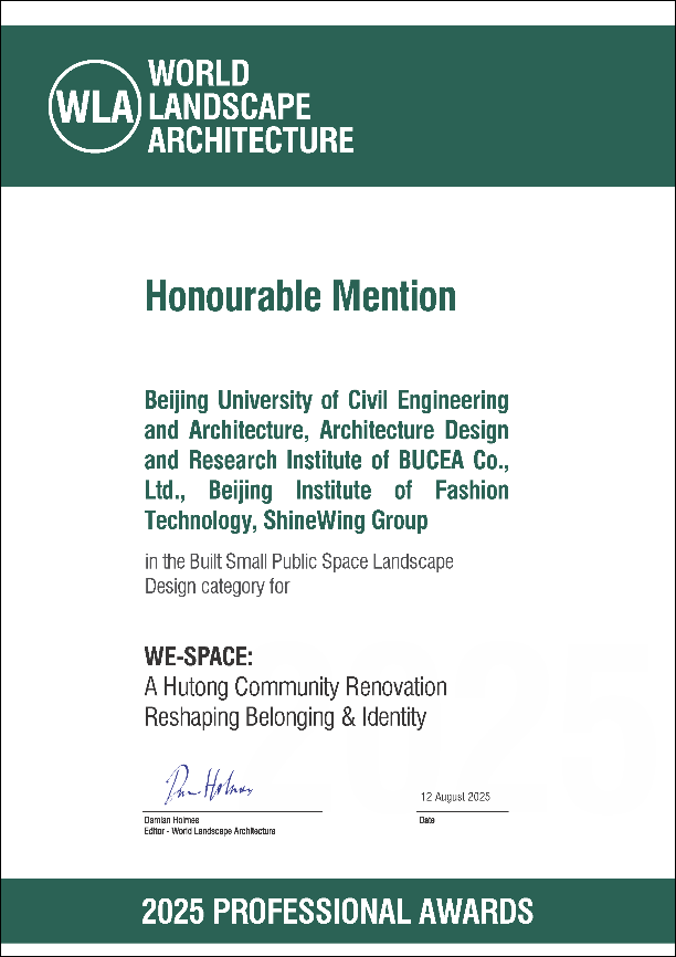 近日,2025 世界景观建筑奖(WLA Awards)公布最终结果,公司天桥街道责任规划师团队牵头的设计项目“WE-SPACE:充满归属感与认同性的胡同社区更新(WE-SPACE: A Hutong Community Renovation Reshaping Belonging & Identity)”,荣获“建成类-小尺度公共空间景观设计(Built-Small Public Space Landscape Design)荣誉提名奖(Honourable Mention)”。