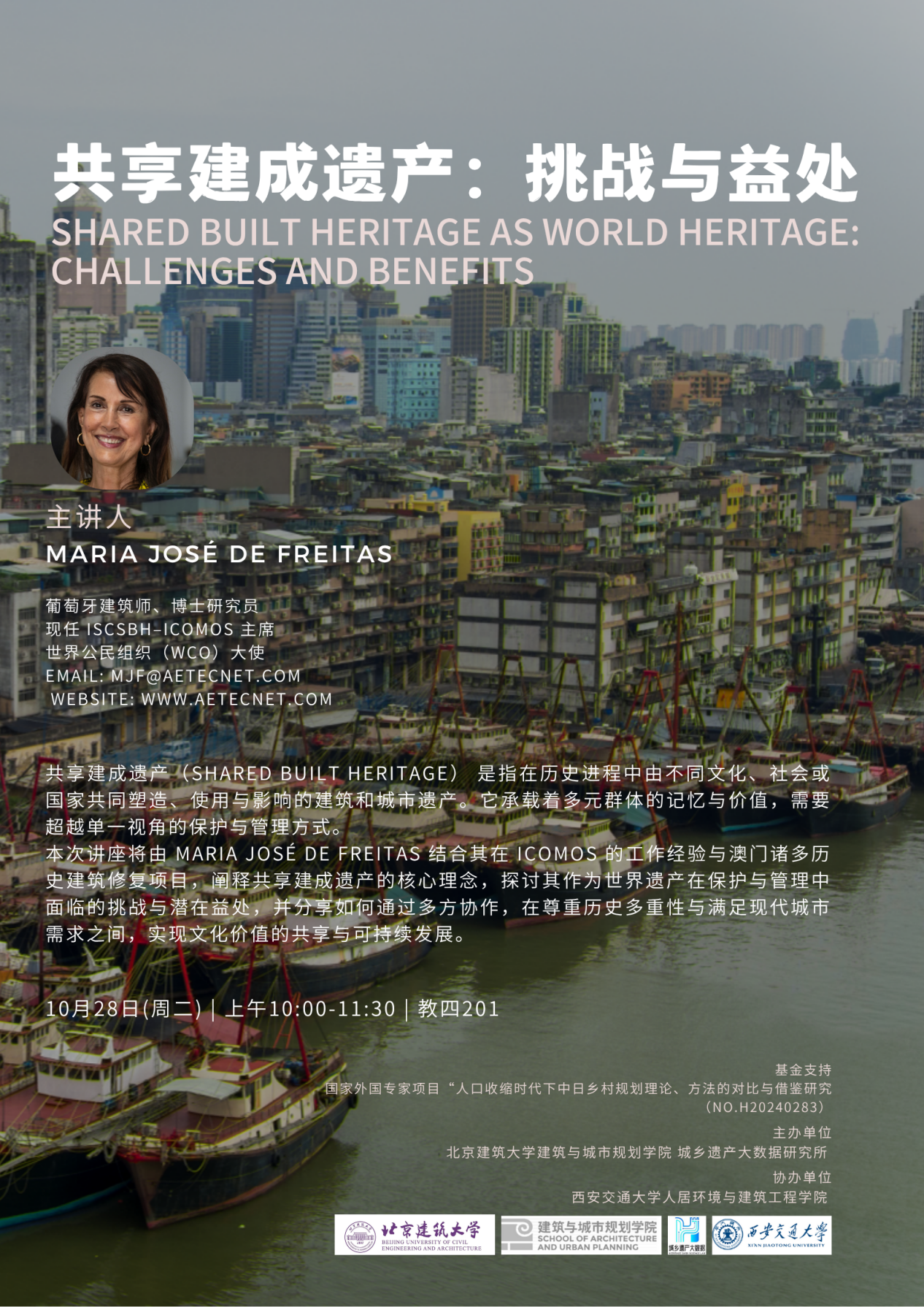 本次讲座将由 Maria José de Freitas 结合其在ICOMOS的工作经验与澳门诸多历史建筑修复项目,阐释共享建成遗产的核心理念,探讨其作为世界遗产在保护与管理中面临的挑战与潜在益处,并分享如何通过多方协作,在尊重历史多重性与满足现代城市需求之间,实现文化价值的共享与可持续发展。