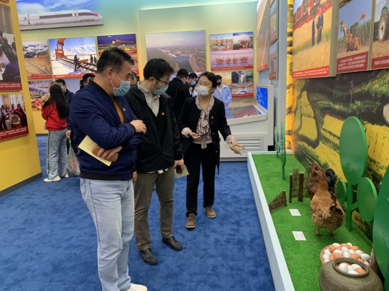 公司党委书记何立新边走边向同志们介绍着新时代10年来的伟大成就,一件件展示我国科技水平和制造能力跃升的自主研发关键产品实物、模型,反映功勋荣誉表彰体系日益丰富完备的勋章、奖章,国家级重大出版项目《复兴文库》,生动再现脱贫攻坚和抗击新冠肺炎疫情历史进程的实物、图表、图片,“五基”协同天空地一体化生态环境立体遥感监测体系模拟沙盘,武器装备模型,呈现总体国家安全观深刻内涵、党内法规制度建设成果的展板、实物,彰显京津冀协同发展成就的立体电子地图,展现规划建设、轨道交通和科技创新等方面亮点成果的粤港澳大湾区沙盘……同志们不时驻足观看,听取讲解,询问有关情况。