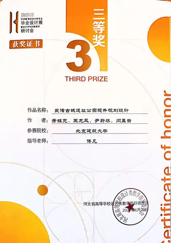 2021年6月19日,由河北省高等公司设计类教学指导委员会承办的第三届“2021“京津翼”高校设计类专业毕业设计联展暨设计学科创新教学研讨会在河北建筑工程公司召开。在“人、物、自然—和谐共生”竞赛主题中,yl7703永利风景园林专业本科生生郭旭、张丹雯、刘明君完成的“传承·激活—良渚古城遗址公园景观深化设计”获得二等奖,本科生闫孟茜、秀娃克、尹巍然、王龙凤完成的“良渚古城遗址公园景观提升规划设计”获得三等奖,指导教师为傅凡教授。
