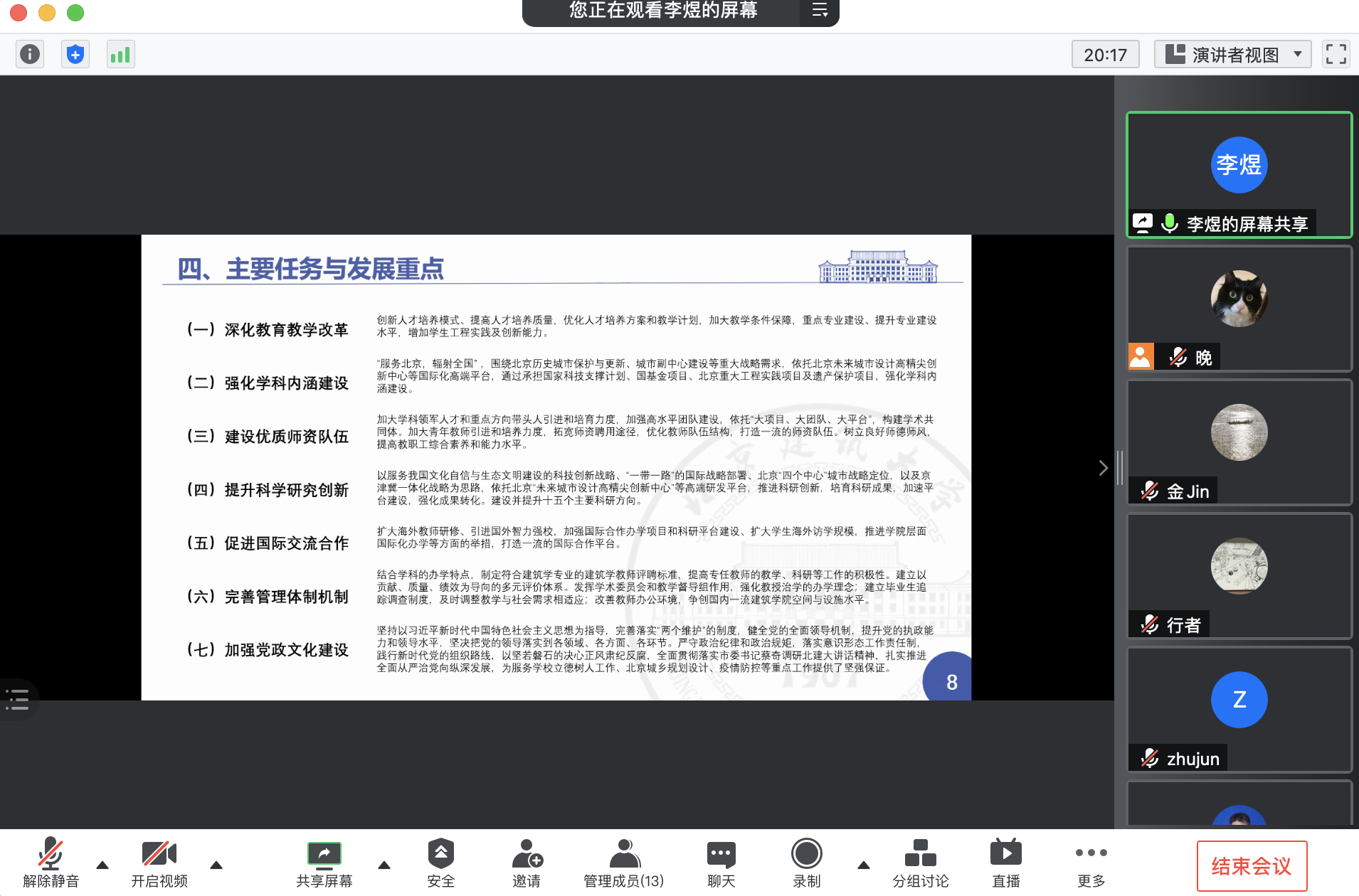 经理张杰提出,公司十四五规划已形成较为完善的整体框架,下一阶段需继续与公司十四五规划报告进行仔细对标,分解任务,梳理完善报告内容。党委书记何立新针对教学环境改善、教学与科研能力提升、员工思想政治教育、青年教师培养、结合专业与师生特点的党建美育品牌、交叉学科突破、学科专业建设与改革等内容提出意见建议,与会教师针对报告内容展开充分讨论。