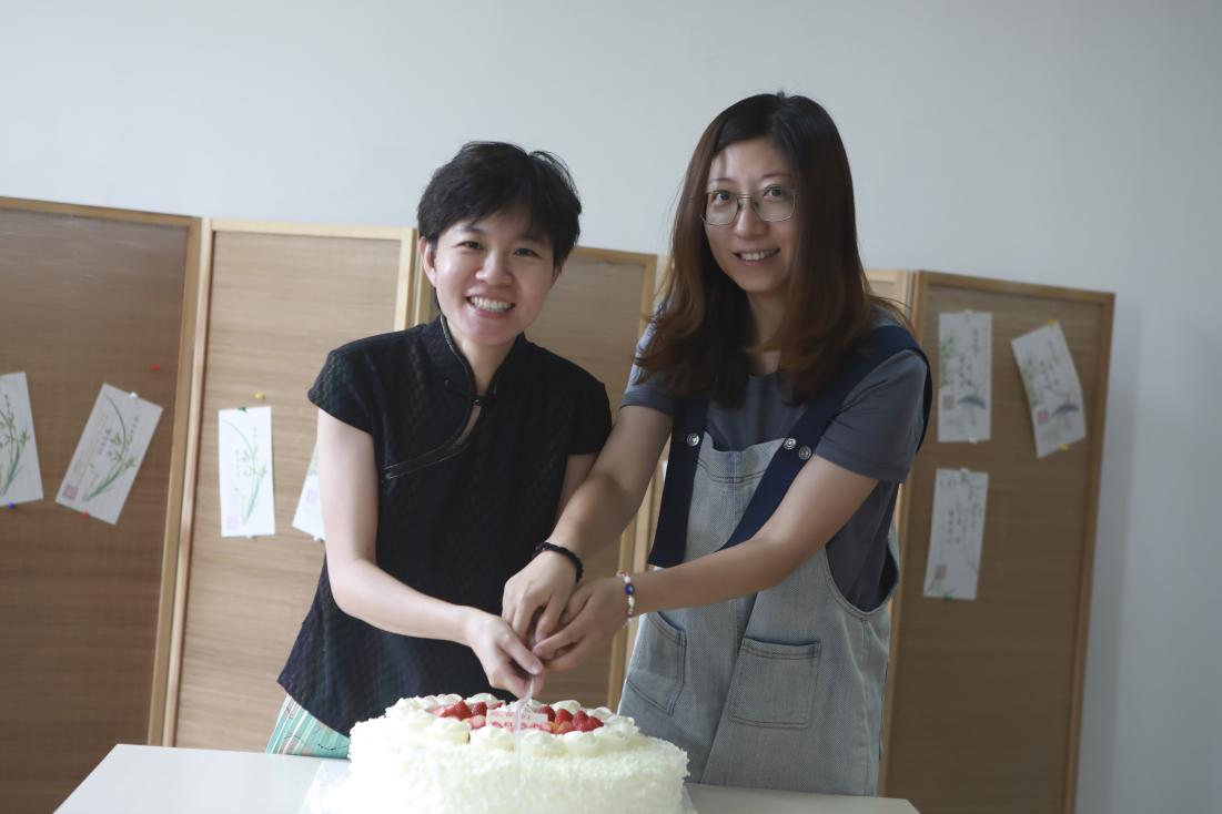 院办陈霞妹老师和张葭老师从“幕后”走到“台前”,以往她们一直负责集体生日会的筹备和组织工作,在自己生日当月,她们也成为主角,代表所有过生日的老师们切下生日蛋糕的第一刀。蛋糕甜蜜蜜,内心暖洋洋。老师们你一言、我一语,诉说着感想、分享着幸福。杨振老师手持相机,捕捉精彩镜头、定格美好瞬间。