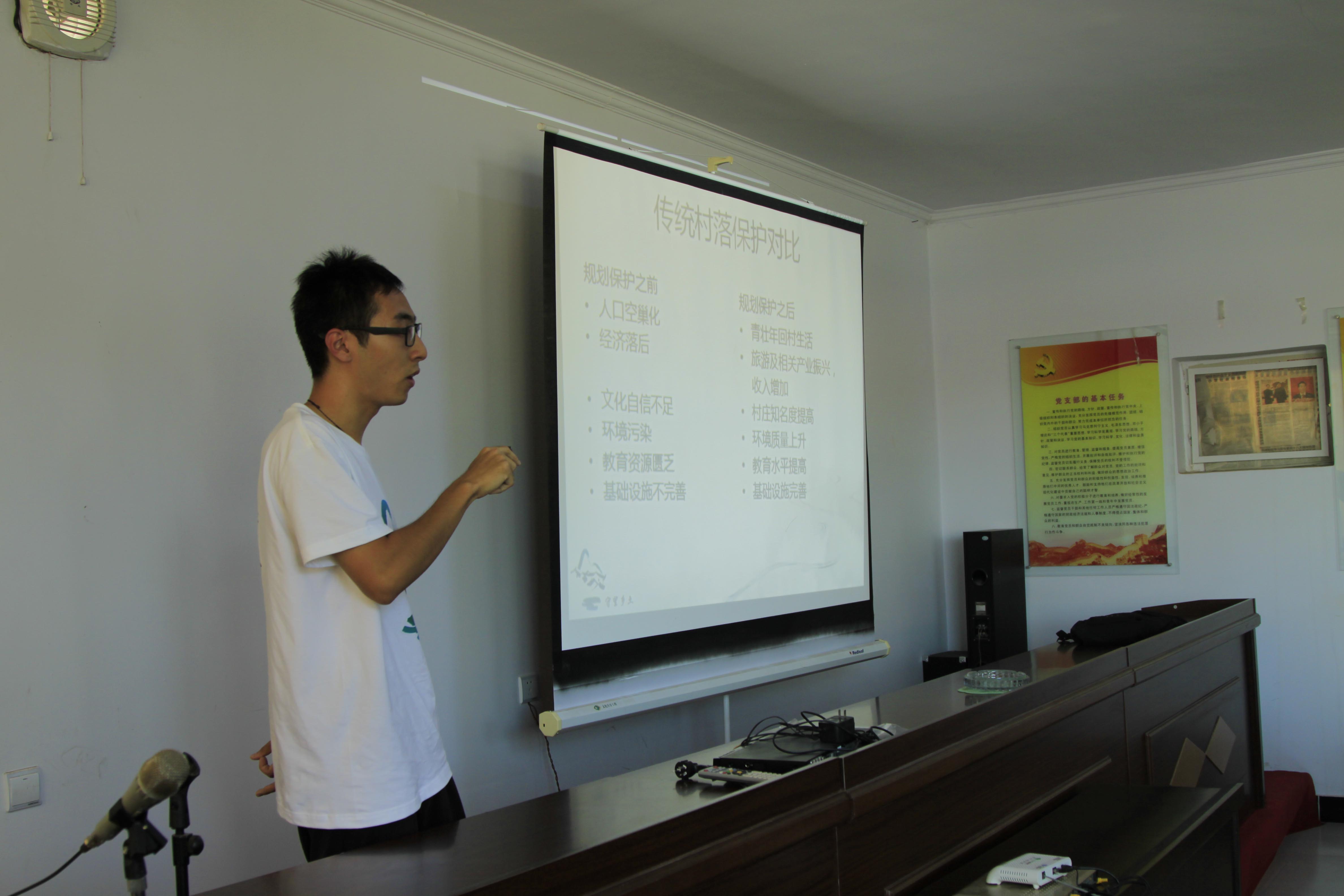 志愿者同学首先从传统村落的概念讲起,向村民们诠释了何为传统村落以及传统村落的文化价值,并结合国家及地方近些年颁布的相关传统村落保护政策让村民了解政府的决心。紧接着,他向村民们展示了有关传统村落保护的成功案例,从北京远近闻名的爨底下村、古北水镇,到拥有与北庄堡村文化遗产碹窑极其相似的陕西柏社村的保护案例,增强了村民对于保护自己村落的里碹窑遗产的信心。最后,他结合北庄堡村文化、自然、地理优势进行分析,进一步树立了村民对于村落优秀文化的文化自信。